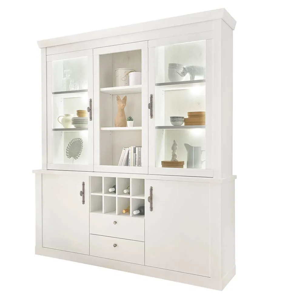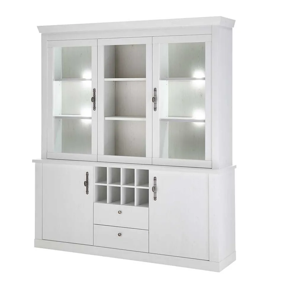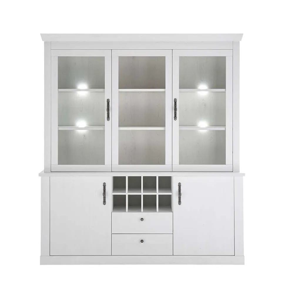 Die Buffetschrank-Vitrine punktet mit einem durchdachten Stauraumkonzept. Mit den Maßen 184 x 207 x 44 cm verfügt sie über zwei Schubkästen, einen Aufsatz mit zwei Glasrahmentüren und drei offene Fächer für Ihre schönsten Dekorationen. Unten befinden sich zwei Türen mit je einem Boden dahinter, sowie acht praktische Flaschenfächer. Das dazugehörige Sideboard mit einer Größe von 201 x 100 x 44 cm ergänzt die Vitrine ideal. Es bietet hinter vier Türen sechs Einlegeböden sowie zwei offene Fächer, die dekorative Highlights in Szene setzen können.