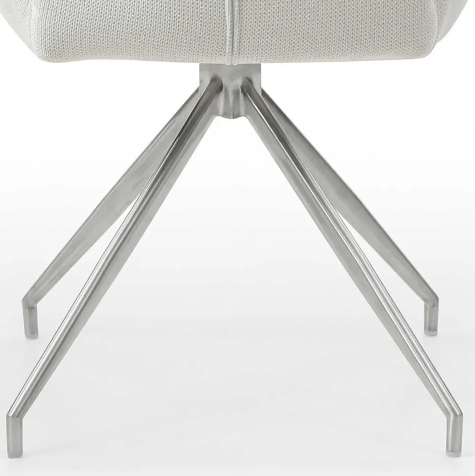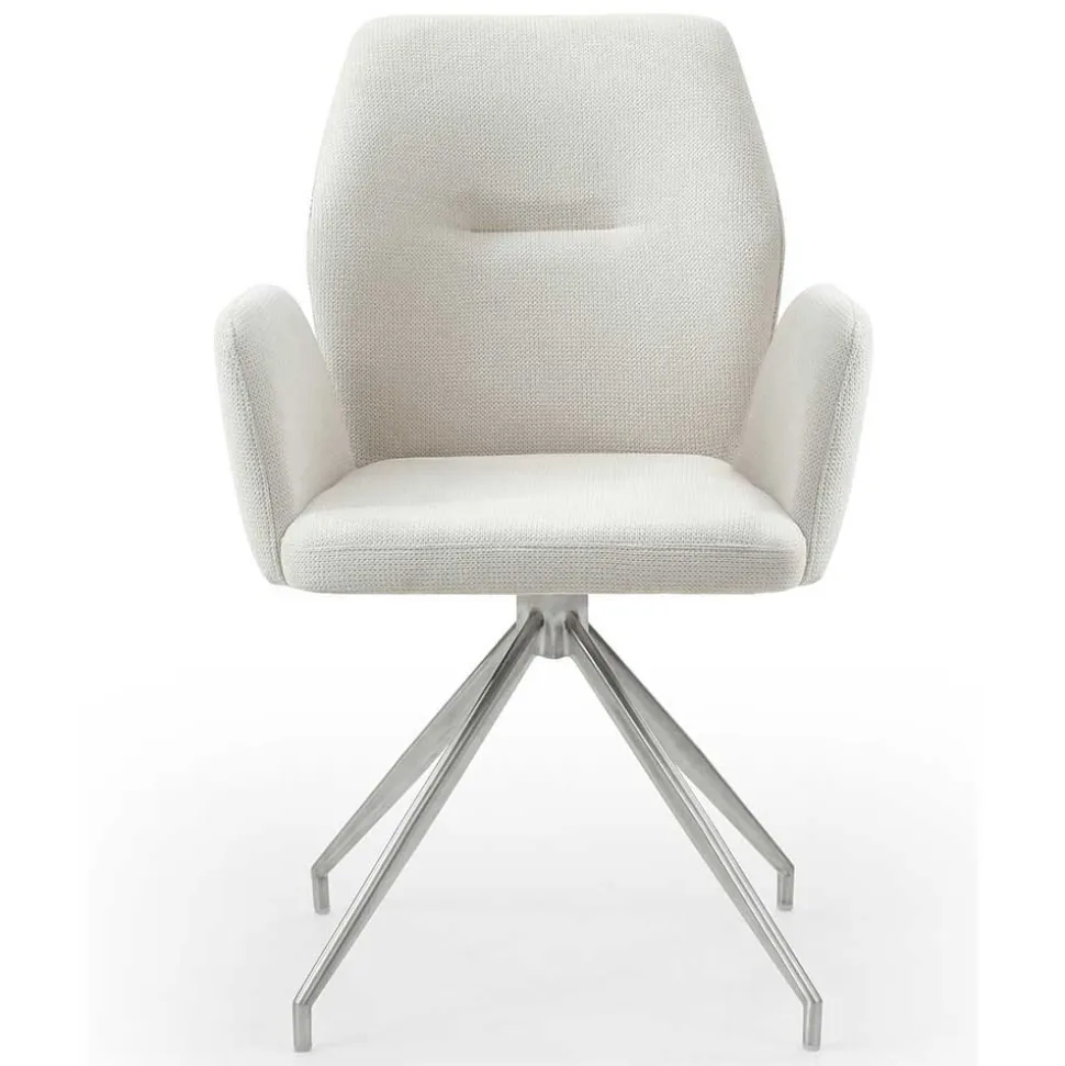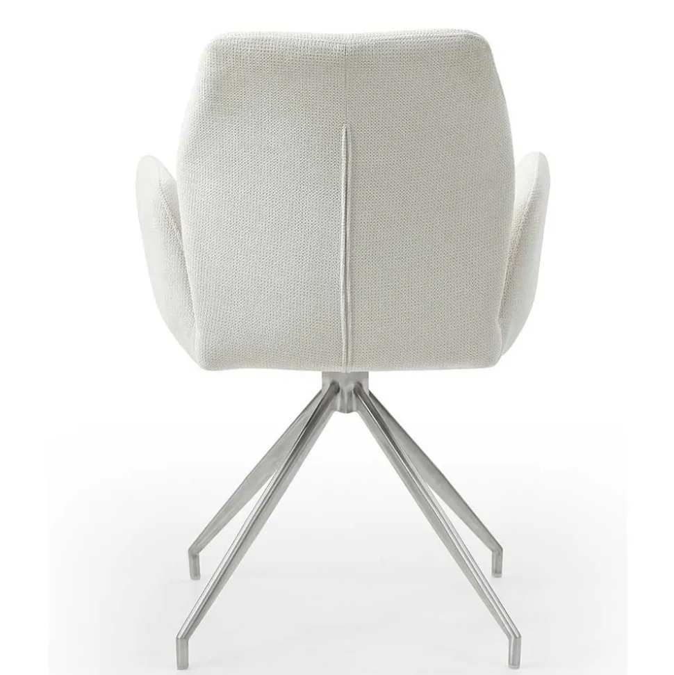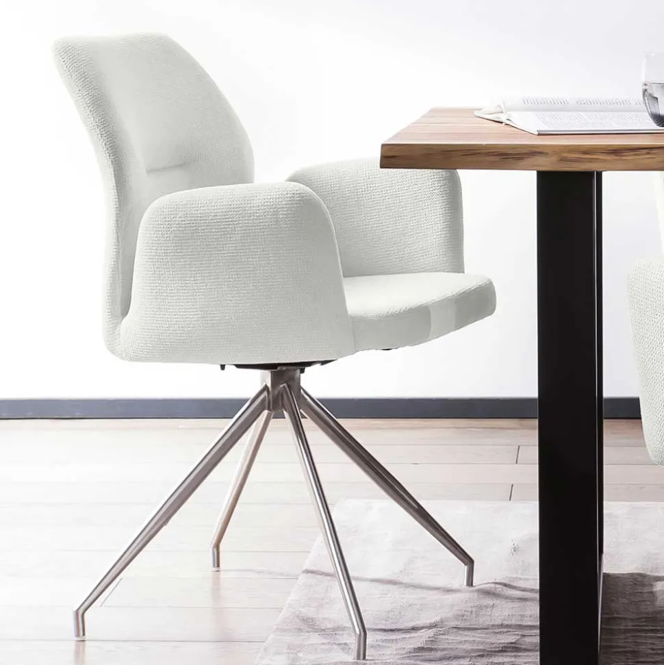 Die vier drehbaren Armlehnenstühle bieten nicht nur visuelle Eleganz, sondern auch höchsten Komfort. Die ergonomisch geformte Rücken- und Armlehne sorgt für eine angenehme Sitzhaltung, während die weiche Schaumstoffpolsterung ein luxuriöses Sitzgefühl vermittelt. Der strukturierte Webstoffbezug in Cremeweiß (100 % Polyester) ist nicht nur angenehm in der Haptik, sondern auch strapazierfähig. Mit einer Scheuerbeständigkeit von 50.000 Martindale und einer Lichtbeständigkeit von 4 bleibt er lange schön. Das Vierfußgestell in Spiderform aus rostfreiem Edelstahl verleiht den Stühlen eine stabile Basis und setzt einen modernen Akzent. Zudem sind die Stühle um 180 Grad drehbar – eine clevere Funktion für mehr Bewegungsfreiheit am Tisch.