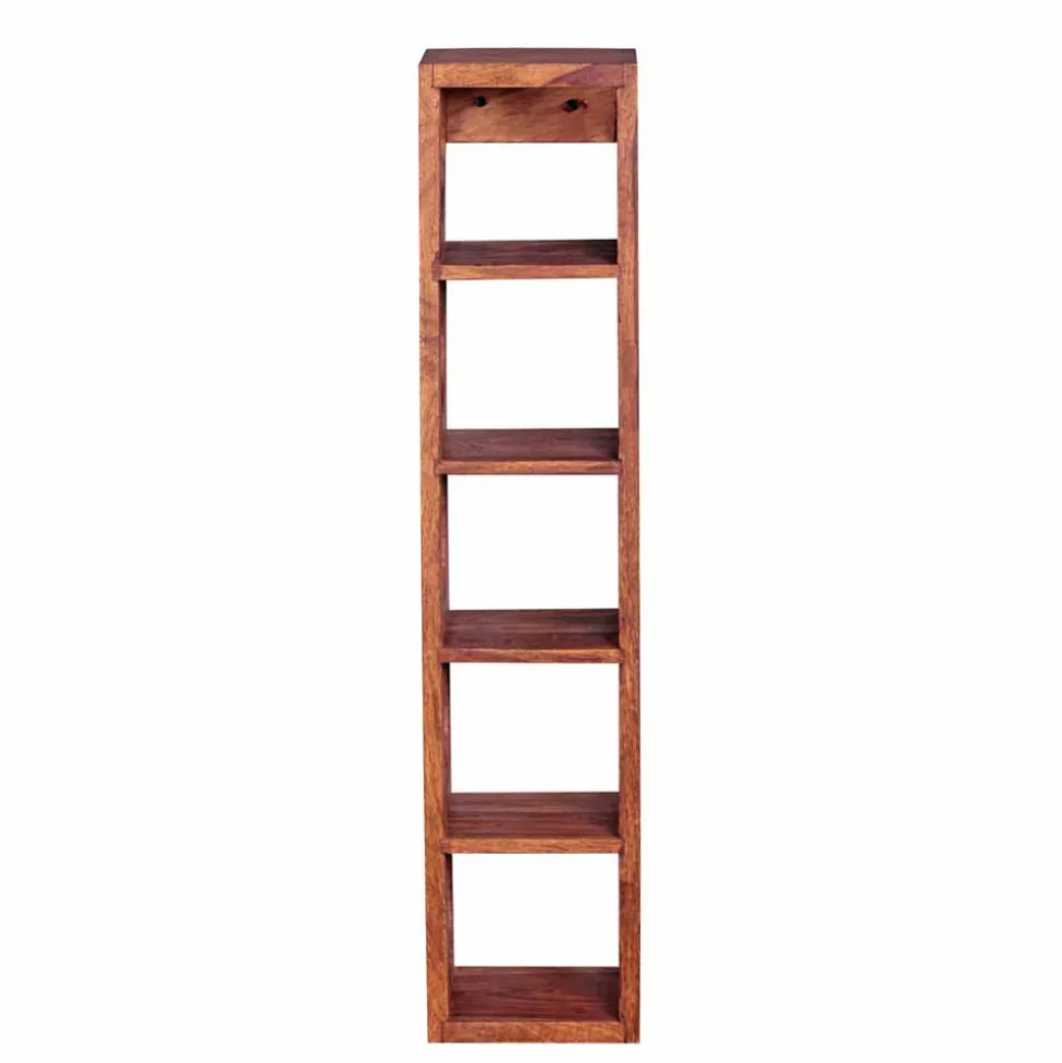 Warme Naturtöne wie goldbraun, honigfarben bis tief dunkelbraun verleihen dem Regal seine markante Ausstrahlung. Diese Farbtöne bringen eine wohnliche Atmosphäre in den Raum und harmonieren ideal mit vielen Möbeln und Einrichtungsstilen. Das dezente Farbspektrum unterstreicht die schlichte Eleganz des Regals, während die natürliche Maserung des Holzes jedem Stück Tiefe und Lebendigkeit verleiht.