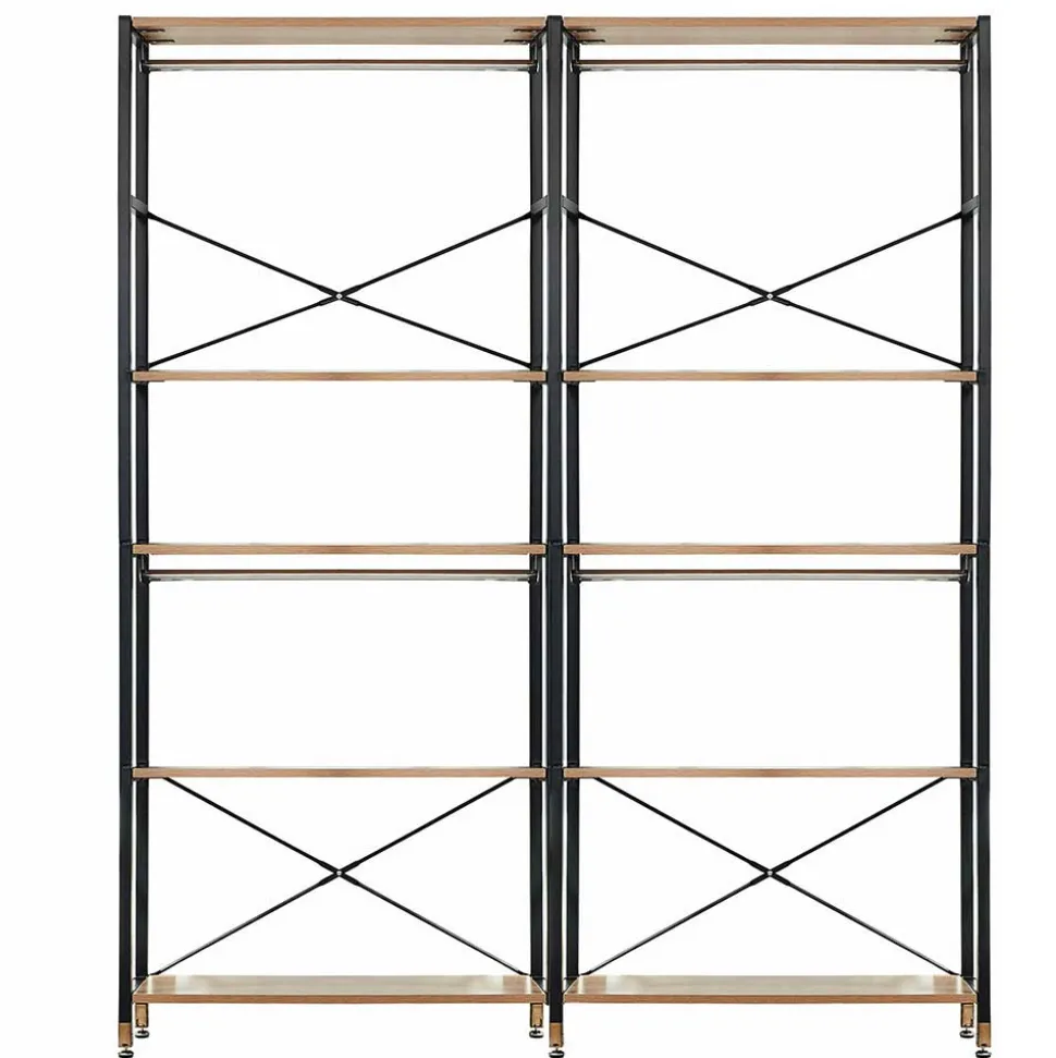 Dieses Regal besteht aus zwei Elementen mit jeweils fünf stabilen Einlegeböden, die einen kühnen Kontrast zum schwarzen Metallrahmen bilden. Die Böden haben eine Stärke von etwa 2,5 cm, was ihnen eine zusätzliche Belastbarkeit verleiht. Zudem verfügt jedes Element über zwei Kleiderstangen aus Metall, während die oberen Böden als praktische Hutablage genutzt werden können.