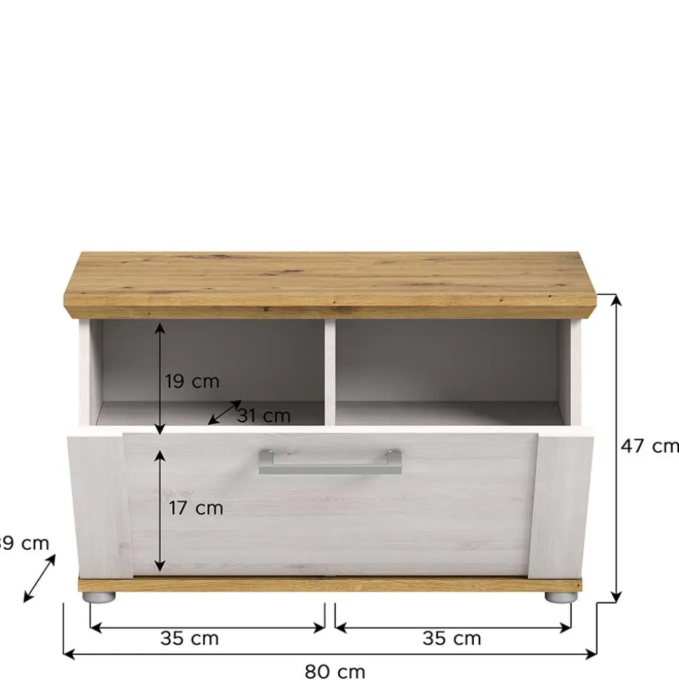 Die Schuhbank „Tocella“ vereint Zweckmäßigkeit und elegantes Design in Holzoptik Lärche Weiß und Wildeichefarben. Sie bietet nicht nur eine praktische Aufbewahrungslösung für Ihre Schuhe, sondern dient auch als bequeme Sitzgelegenheit im Flur oder Eingangsbereich. Mit einer kompakten Größe von 80 x 47 x 39 cm fügt sich diese Bank mühelos in Ihr Zuhause ein und bringt Ordnung in den Flur.