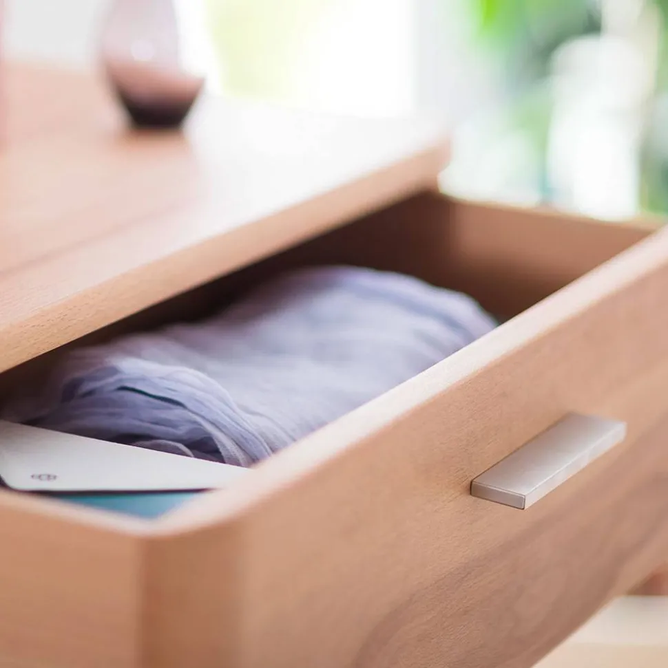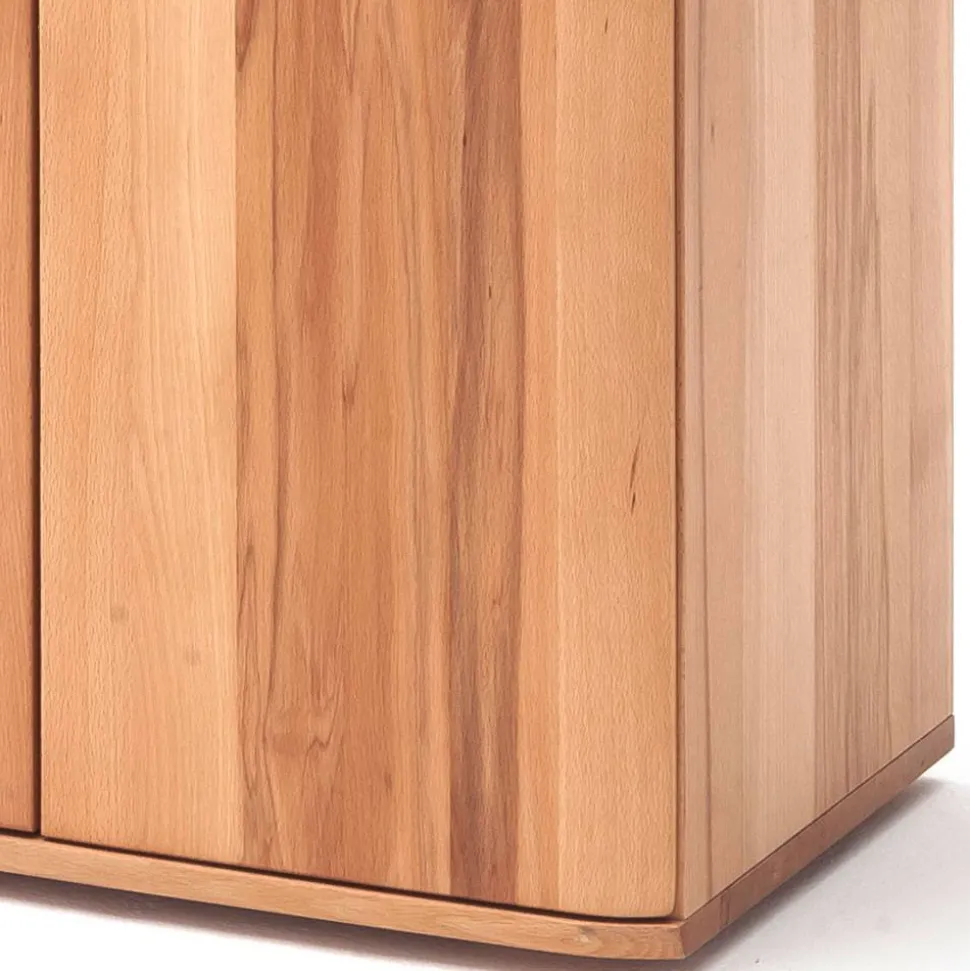 Das Vertiko ist teilmassiv gefertigt: Die Front besteht aus Kernbuche Massivholz, der Korpus aus Spanplatte mit echtholzfurnierter Kernbuche-Oberfläche. Flache Holzfüße (6 x 1,5 x 6 cm) sorgen für stabilen Stand, während die silberfarbenen Metallgriffleisten das Design geschmackvoll ergänzen. Eine zusätzliche Kippsicherung wird für mehr Sicherheit mitgeliefert.