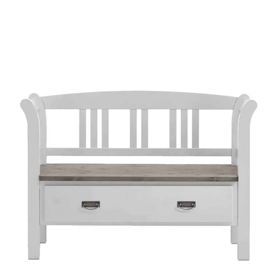 Die Garderobenbank „Yoan“ setzt auf eine elegante Kombination aus weiß lackierten Oberflächen und einer grau gebeizten Sitzfläche. Durch die sorgfältige Lackierung bleibt die wunderschöne Holzmaserung sichtbar, was den natürlichen Charakter des Möbelstücks unterstreicht. Der sanfte Farbkontrast verleiht Ihrem Flur eine einladende, stilvolle Optik und lässt sich wunderbar mit anderen Möbeln kombinieren.