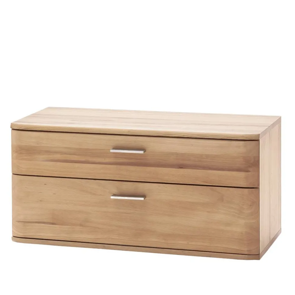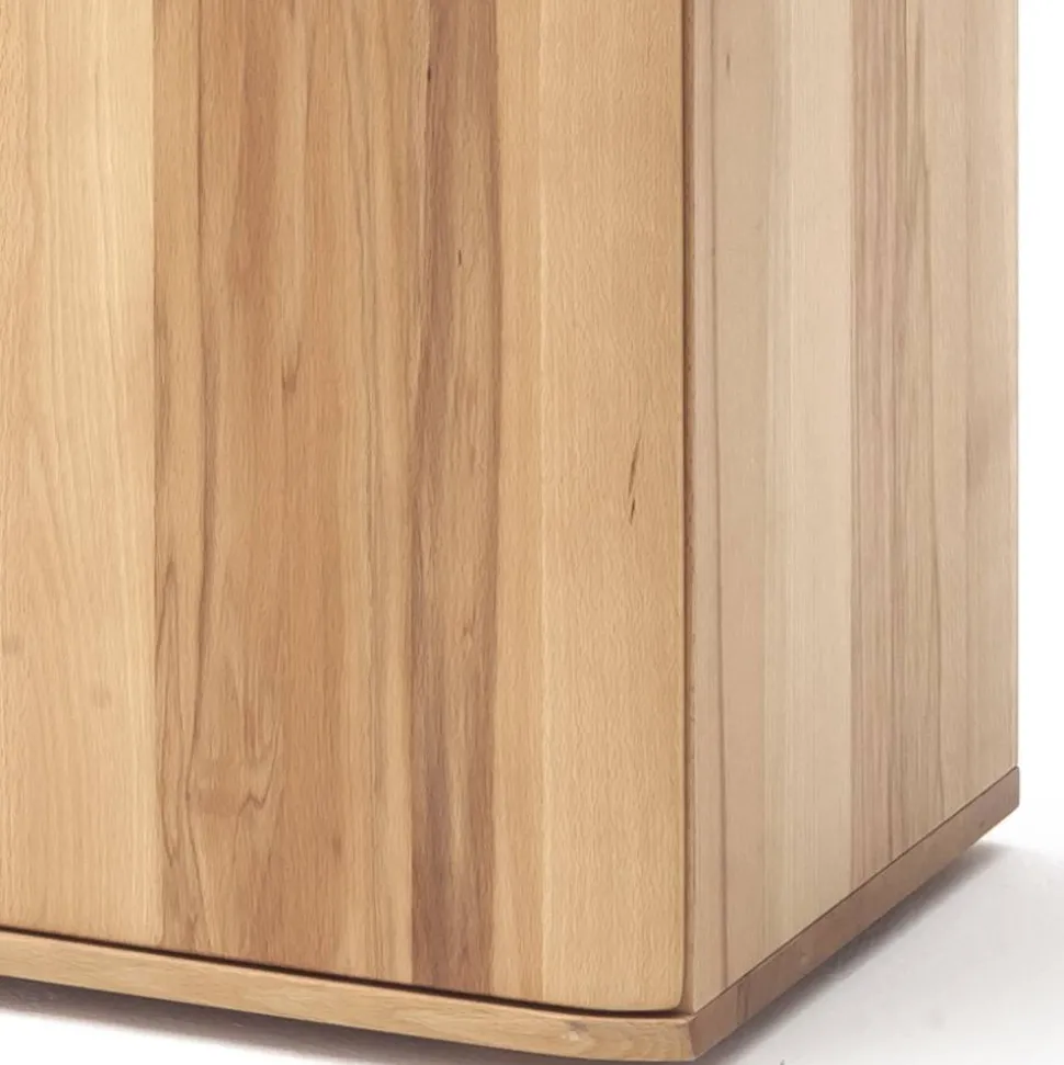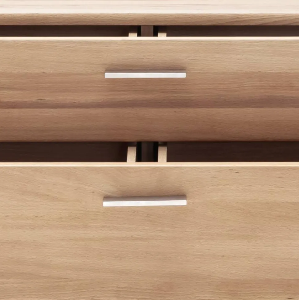 Das teilmassive Set kombiniert Kernbuche Massivholz (Front) mit echtholzfurnierten Spanplatten (Korpus) und Spiegelglas. Alle Holzoberflächen sind geölt, was die natürliche Struktur hervorhebt und für einen edlen Look sorgt. Silberfarbige Metall-Griffleisten und hochwertige Metallbeschläge runden das elegante Design ab.