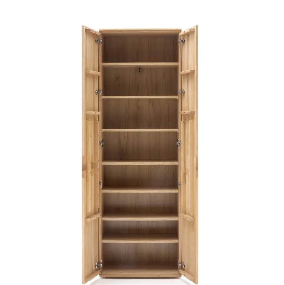 Die Schubladen sind mit Soft-Close-Unterflurauszügen ausgestattet, die Türen verfügen über gedämpfte Metallbeschläge, und die Einlegeböden sind verstellbar. Die ausziehbare Kleiderstange im Garderobenschrank sorgt für eine flexible Aufbewahrungslösung, während das Vertiko Platz für bis zu 12 Paar Schuhe bietet.