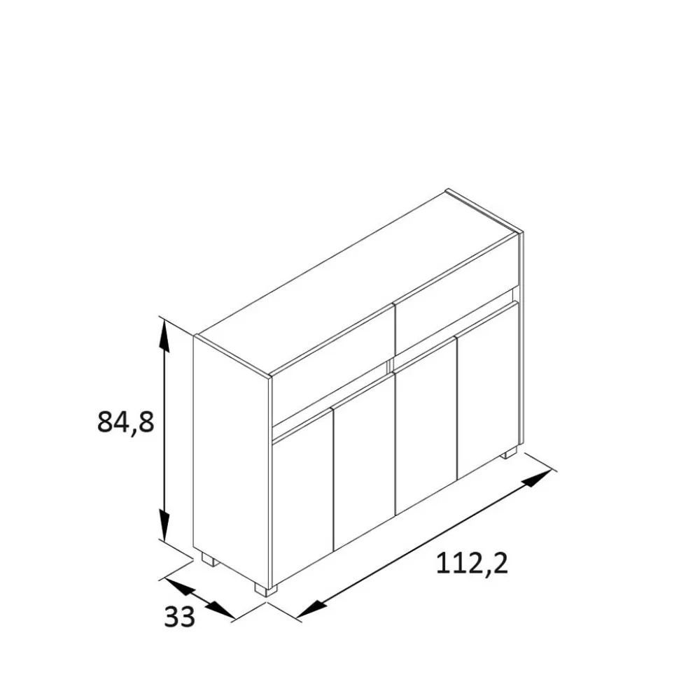 Mit seinen Maßen von 112,2×84,8×33 cm überzeugt das Sideboard als wahres Organisationstalent. Vier Türen verbergen zwei große Fächer mit je einem verstellbaren Einlegeboden. Zwei Schubladen (je 50x15x26 cm Innenmaß) bieten zusätzlichen Stauraum für kleinere Utensilien. Der mittig platzierte Stützfuß sorgt für zusätzliche Stabilität. Die Fachinnenmaße ohne Böden betragen je ca. 53,7x60x29 cm.