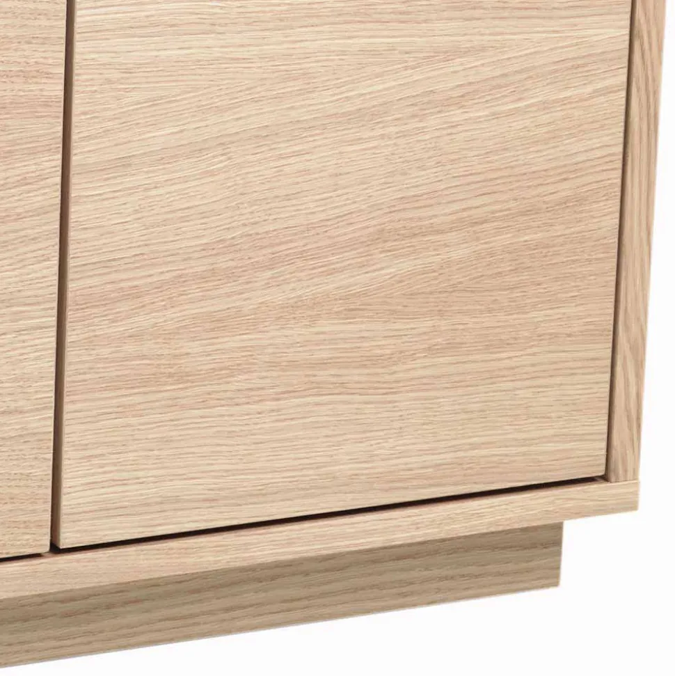 Die Oberfläche ist aufwendig mit einem Eiche-Furnier im Whitewash-Verfahren veredelt und anschließend lackiert. Diese Veredelung schützt das Holz nicht nur zuverlässig vor Feuchtigkeit und Abnutzung, sondern lässt auch die natürliche Maserung dezent durchscheinen – für eine wohnliche, helle Atmosphäre mit langlebigem Schutz.