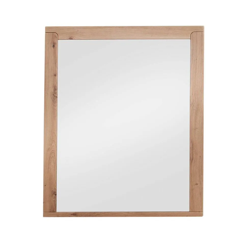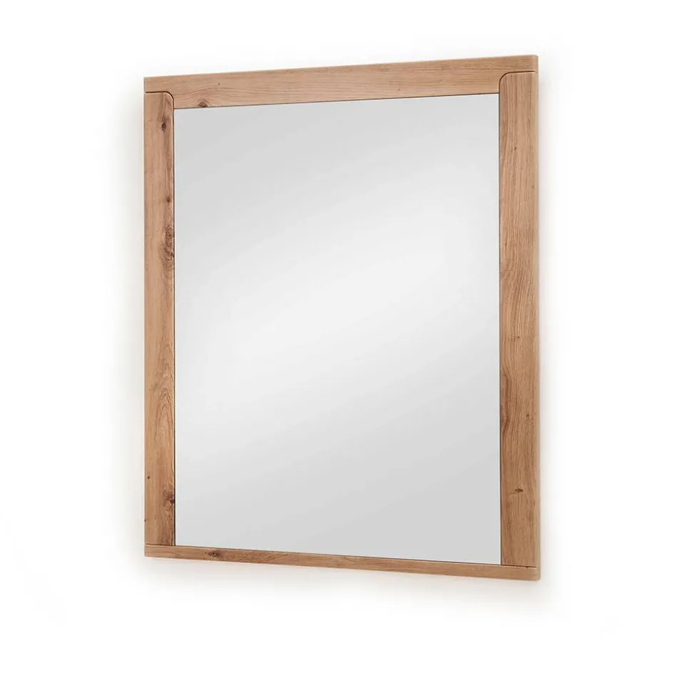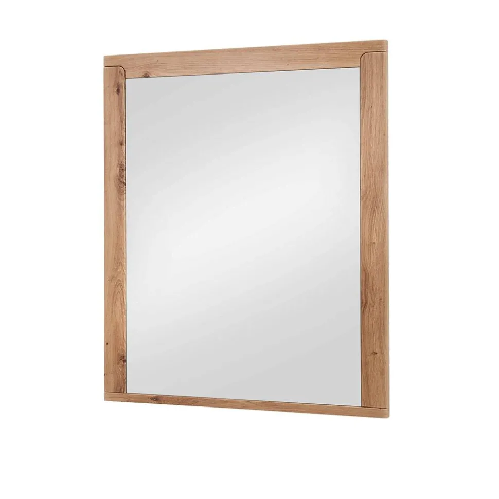 Gefertigt aus robustem Spiegelglas und MDF, zeichnet sich der „Carry“ Spiegel durch eine sorgfältige Verarbeitung aus. Sein Rahmen ist tiefgezogen foliert und überzeugt mit einer eleganten Holzoptik, die eine natürliche Ästhetik vermittelt. Die stabile Umrandung aus Holzwerkstoff mit einer Stärke von 2,2 cm sorgt für eine wertige und langlebige Struktur.