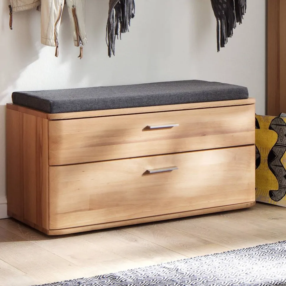 Die Front der Garderobenbank besteht aus Kernbuche Massivholz, während der Korpus aus robustem, echtholzfurniertem Holzwerkstoff gefertigt ist. Die Bank steht auf flachen Holzfüßen mit den Maßen 6 x 1,5 x 6 cm und verfügt über silberfarbene Metallgriffleisten, die einen modernen Akzent setzen. Das Ober- und Unterboden-Design ist vorne mit massiven Anleimern verstärkt, was die Stabilität zusätzlich erhöht.