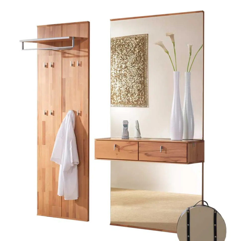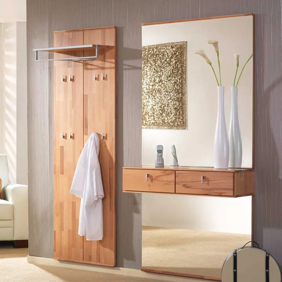 Ein hochwertiges Garderobenset, das Funktionalität und Stil perfekt vereint: Das Garderobenset „Coestra“ stammt aus deutscher Produktion und überzeugt durch sein modernes, durchdachtes Design. Es besteht aus einem eleganten Garderobenpaneel und einem stilvollen Spiegel mit integrierter Ablage. Dank der hochwertigen Verarbeitung und dem Einsatz von massivem Kernbuchenholz bringt dieses Set natürliche Schönheit und Funktionalität in Ihren Eingangsbereich.