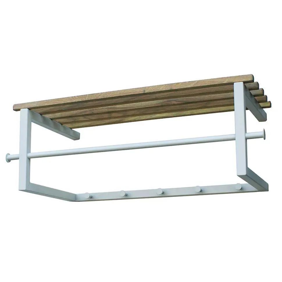 - Die Breite der Stange beträgt 76 cm, die Breite der Lamellen auf der Oberseite der Garderobe 71 cm