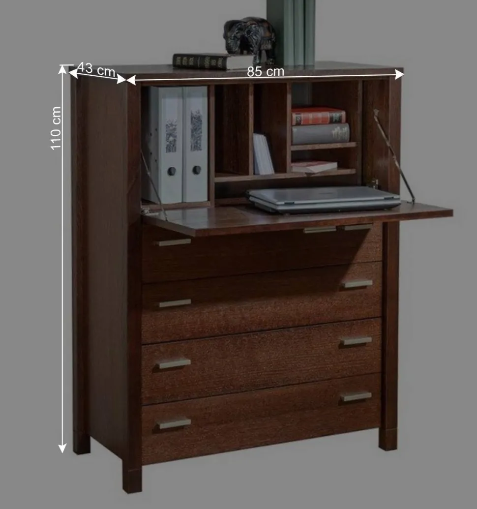 Dieser Sekretär überzeugt nicht nur mit seinem dezent modernen Look, der sich nahtlos in jedes Ambiente einfügt, sondern auch mit seiner durchdachten Konstruktion. Mit einer Breite von 85 cm, einer Höhe von 110 cm und einer Tiefe von 43 cm ist „Glosidrana“ ein Paradebeispiel für effiziente Raumausnutzung in jedem Heimbüro. Vier geräumige Schubkästen mit sanftem Metall-Unterflurauszug und eine großzügige Schreibklappe, ausgestattet mit funktionellen Metallbeschlägen, bieten ausreichend Platz für alle Ihre Büromaterialien.