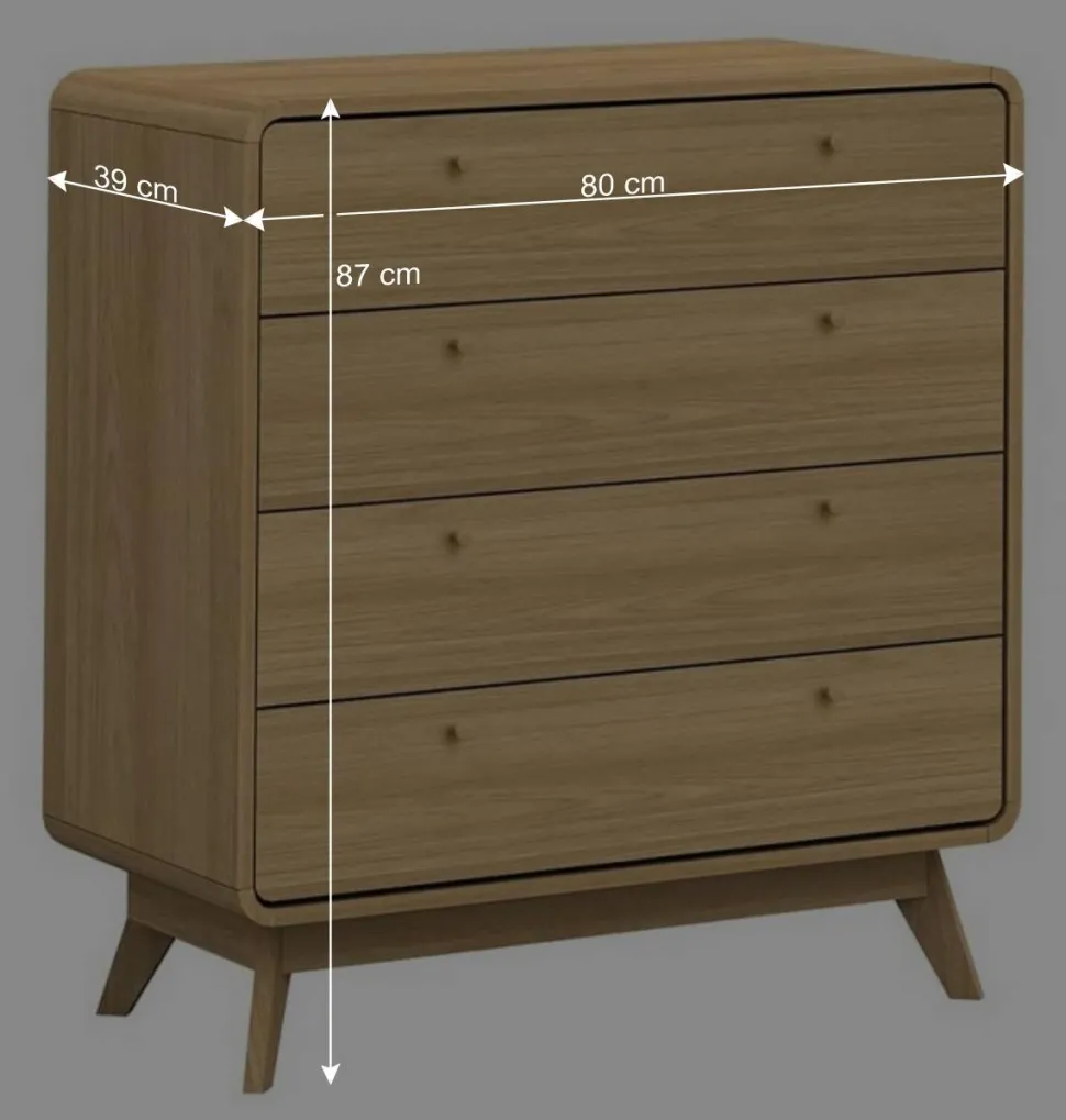 Mit Maßen von 80 cm Breite, 87 cm Höhe und 39 cm Tiefe bietet die „Sophiea“ Kommode überraschend viel Stauraum auf kleiner Fläche. Die vier Schubladen mit Metallauszug und praktischen, kleinen Kunststoff-Knopfgriffen bieten Ihnen ausreichend Platz, um all Ihre Utensilien übersichtlich und griffbereit zu verstauen. Der Oberboden, mit einer Stärke von ca. 3,6 cm, eignet sich perfekt, um Deko-Elemente oder wichtige Alltagsgegenstände zu präsentieren.