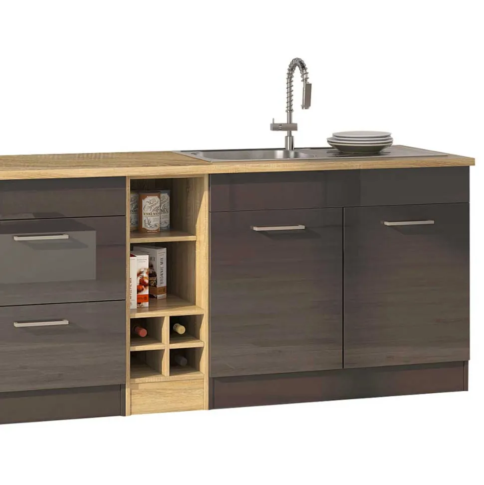 Zum Einsatz kommen widerstandsfähige und pflegeleichte Materialien: Die Fronten bestehen aus MDF – einem besonders formstabilen Werkstoff, der eine glatte Oberfläche und hohe Belastbarkeit bietet. Für die Korpusse wurde robuste Spanplatte verwendet, die sich durch geringes Gewicht und Stabilität auszeichnet. Die Arbeitsplatte und die offenen Regalelemente wurden in täuschend echter Sonoma Eiche Holzoptik gefertigt und mit einer Melaminbeschichtung veredelt. Diese Beschichtung schützt die Oberfläche vor Kratzern, Feuchtigkeit und Hitze und lässt sich leicht reinigen – ideal für den täglichen Gebrauch. Die grauen Fronten sind mit einer hochwertigen Hochglanzfolie überzogen, die mit modernem Verfahren nahtlos aufgetragen wird. Das Ergebnis: eine glänzende, spiegelglatte Oberfläche, die Eleganz ausstrahlt und pflegeleicht bleibt.