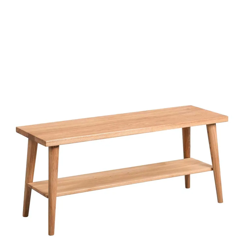 Die Garderobenbank „Liorys“ ist aus massiver Wildeiche gefertigt und verfügt über eine geölte Holzoberfläche. Das schräge Vierfußgestell sorgt für einen sicheren Stand und Stabilität.