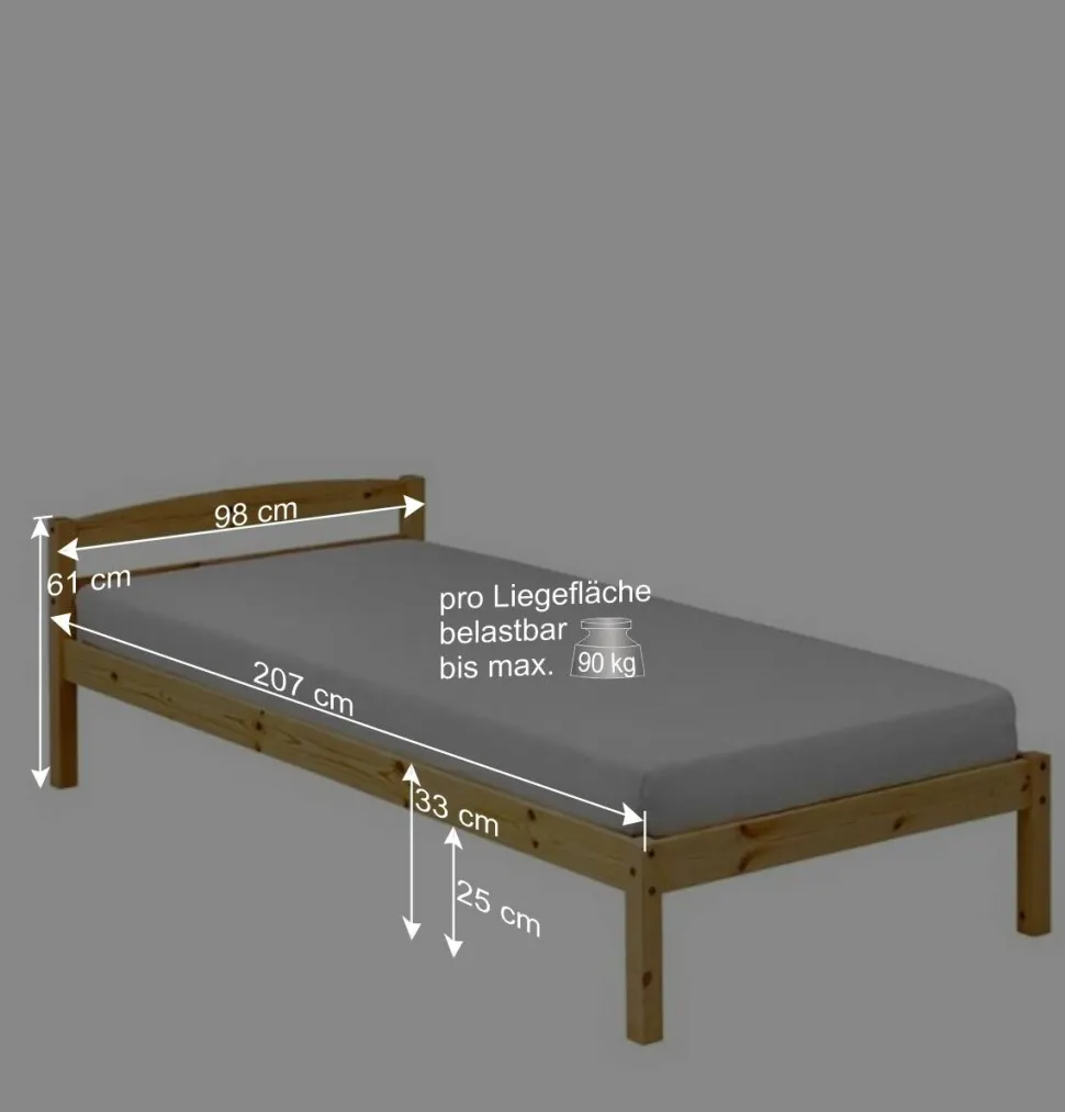 Ein weiterer praktischer Aspekt ist der Bodenabstand von 25 cm, der nicht nur die Reinigung unter dem Bett erleichtert, sondern auch eine optimale Luftzirkulation gewährleistet. Die Einstiegshöhe von 33 cm bietet einen komfortablen Zugang, der es leicht macht, ins Bett zu steigen und morgens aufzustehen.