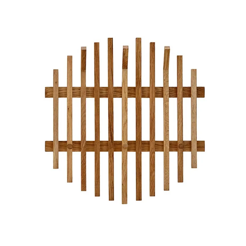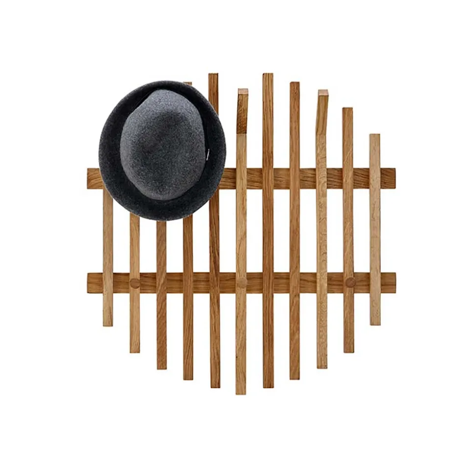 Die „Gangizo“ Hänge-Garderobe besteht aus elf vertikalen Eichenholzleisten, die auf zwei horizontalen, breiteren Leisten befestigt sind. Diese vertikalen Leisten variieren in ihrer Länge und sind so angeordnet, dass eine annähernd runde Silhouette entsteht. Sechs robuste Kleiderhaken bieten ausreichend Platz für Jacken, Mäntel und Accessoires. Drei Haken sind in abgewinkelter Form im oberen Bereich platziert, während drei runde Knopfhaken weiter unten auf unterschiedlichen Leisten angebracht sind. Jeder Haken ist bis zu 2 kg belastbar, was diese Garderobe zu einem praktischen und stilvollen Ordnungshelfer macht.