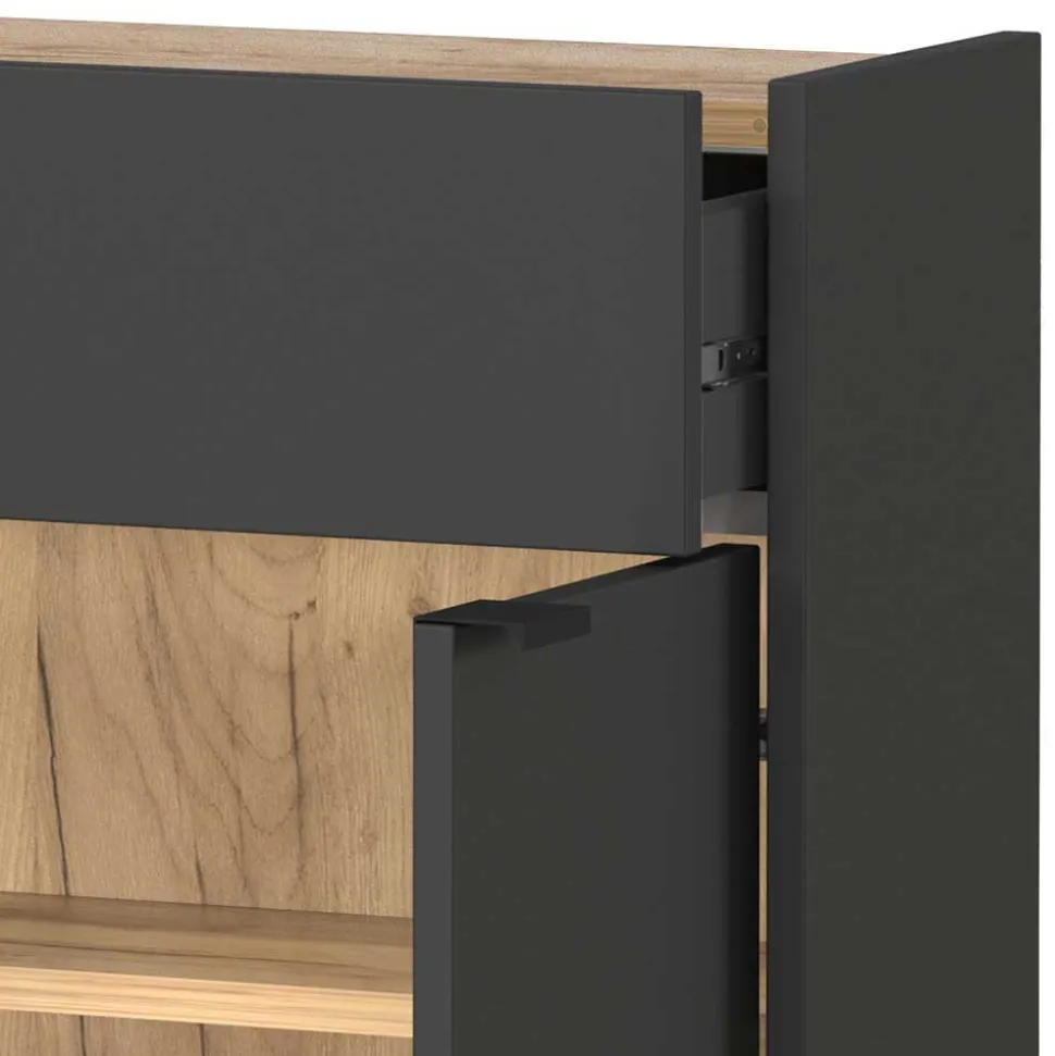 Ein modernes Zuhause verlangt nach Möbeln, die nicht nur praktisch, sondern auch optisch ansprechend sind. Die Garderobenmöbel „Sidgarus“ kombinieren eine elegante dunkelgraue Farbgebung mit einer warmen Wildeiche-Optik – eine zeitlose Kombination, die sich mühelos in jedes Ambiente einfügt. Die schlichte Formensprache sorgt für eine moderne Ausstrahlung, während die durchdachte Konstruktion maximale Funktionalität bietet.