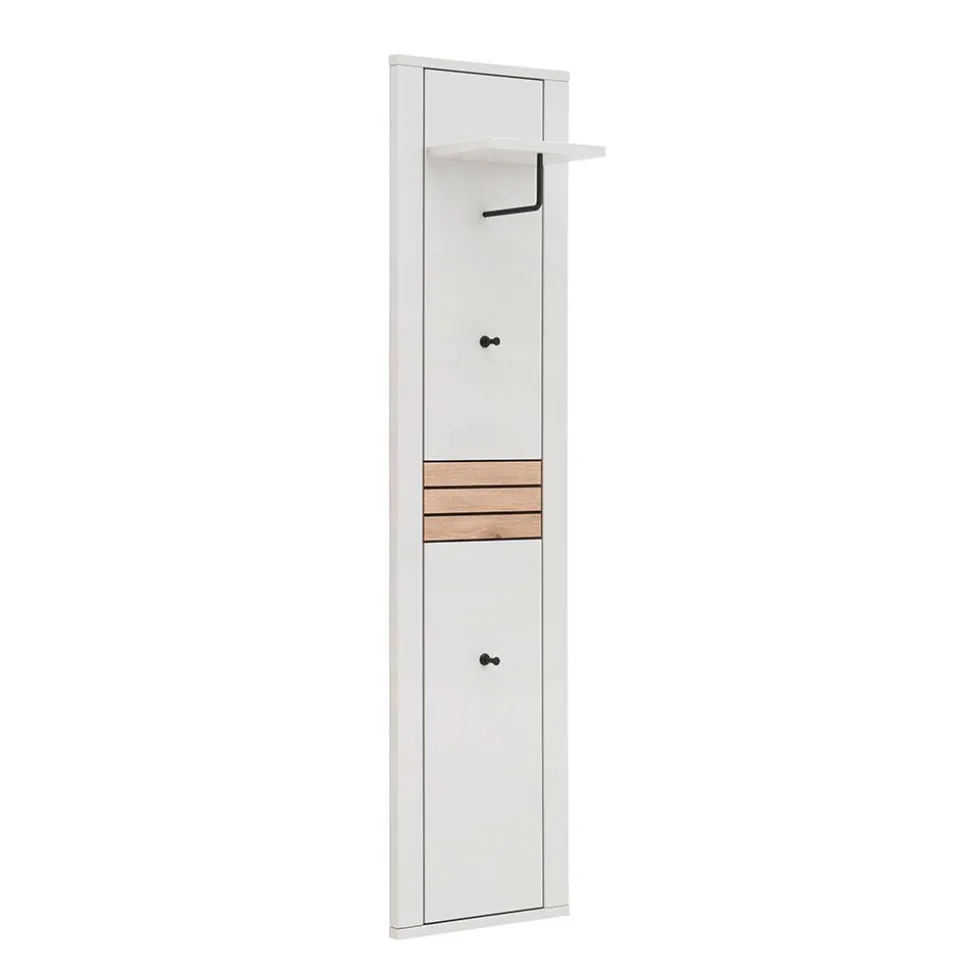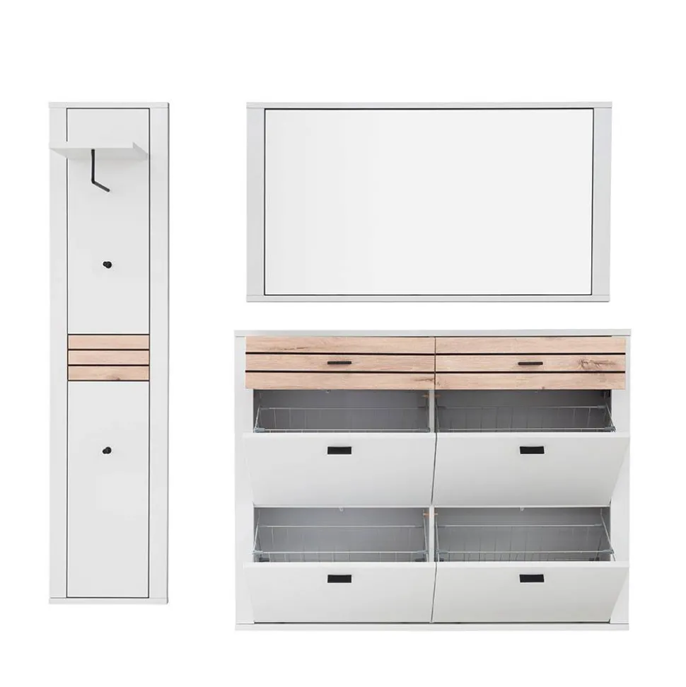Dank der hängenden Konstruktion lässt sich das Set besonders effizient in kleineren oder schmalen Fluren einsetzen, ohne wertvollen Platz zu beanspruchen. Die Kombination bietet Stauraum für Schuhe, Jacken und Accessoires, während der großzügige Spiegel den Raum optisch erweitert.
