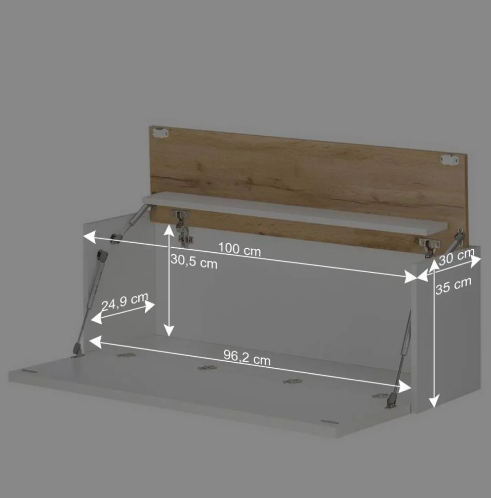 Mit Maßen von 100 cm Breite, 35 cm Höhe und 30 cm Tiefe ist dieser Sekretär ideal für das Home Office oder kleinere Räume. Die Schreibklappe ist mit gasdruckgedämpften Metallbeschlägen ausgestattet, die ein angenehmes und sicheres Öffnen und Schließen ermöglichen. Die Tischplatte bietet mit ihrer Stärke von ca. 2,5 cm eine solide Arbeitsfläche. Hinter der Klappe befindet sich ein geräumiges Fach mit den Innenmaßen von ca. 96,2×30,5×24,9 cm.