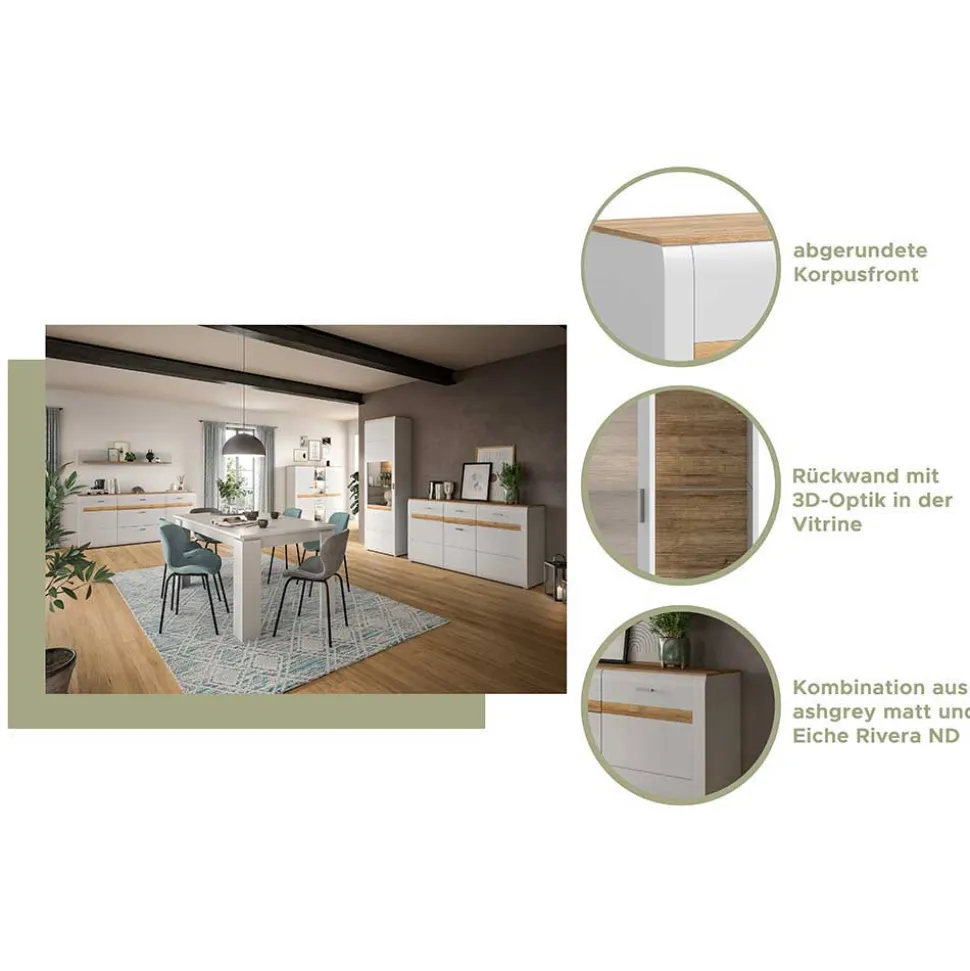 - Pflegeleicht beschichtete Oberflächen in Lichtgrau matt und Holzoptik Eiche