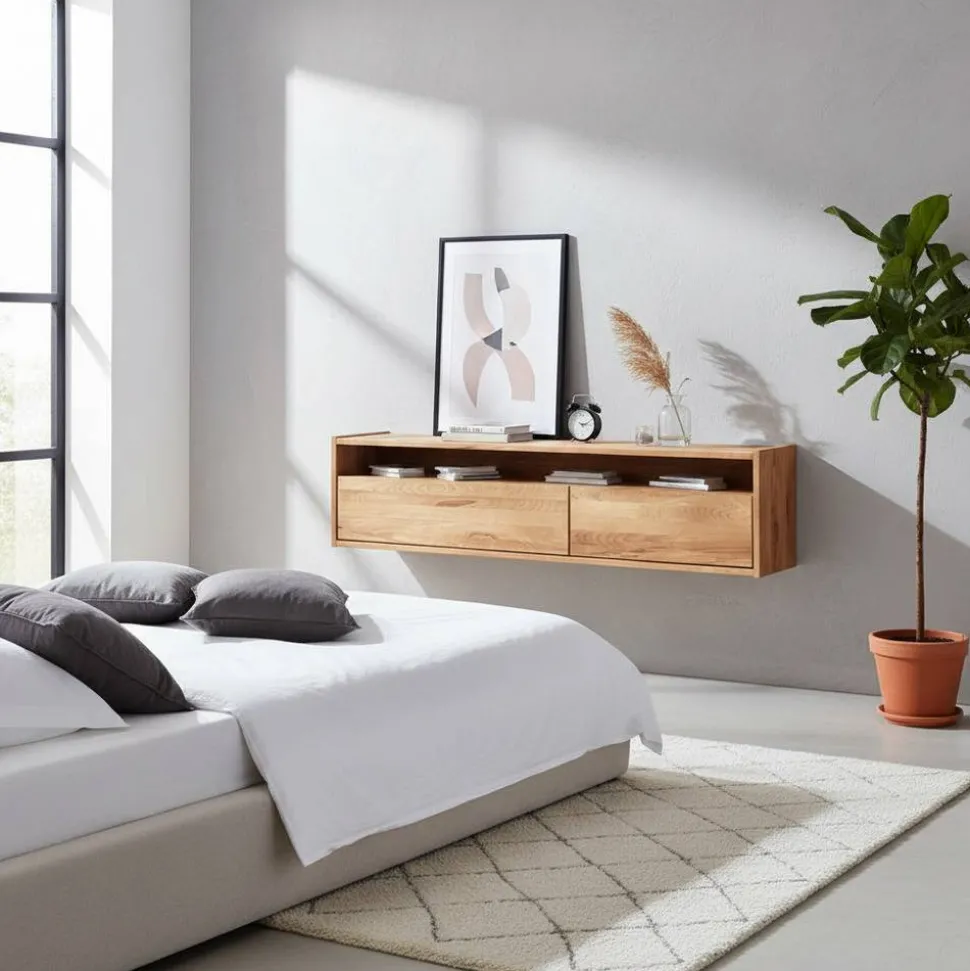 Mit einer Breite von 148 cm, einer Höhe von 37 cm und einer Tiefe von 34 cm bietet „Salomonia“ viel Stauraum, ohne dabei aufdringlich zu wirken. Zwei Schubladen mit langlebiger Metallführung und einer innovativen Soft-Close-Funktion ermöglichen ein leises und sanftes Schließen. Die Schubladeninnenhöhe von etwa 14 cm bietet ausreichend Platz für Ihre Utensilien. Oberhalb der Schubkästen befindet sich ein durchgehendes offenes Fach, ideal zur Präsentation Ihrer Deko-Objekte.