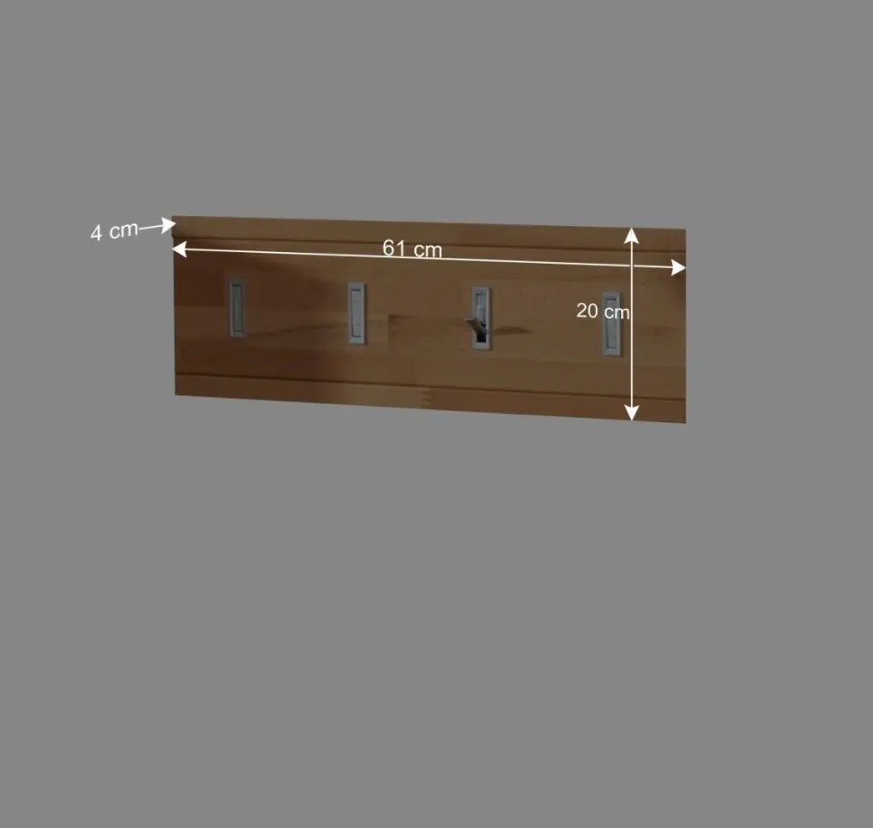 Mit den Maßen 61 cm Breite, 20 cm Höhe und 4 cm Tiefe bietet unsere Wandgarderobe „Wislama“ ausreichend Platz für Ihre Jacken, Taschen und Accessoires, ohne dabei viel Raum einzunehmen. Diese Kompaktheit macht sie besonders vielseitig einsetzbar – sei es im Flur, im Schlafzimmer oder sogar im Büro.