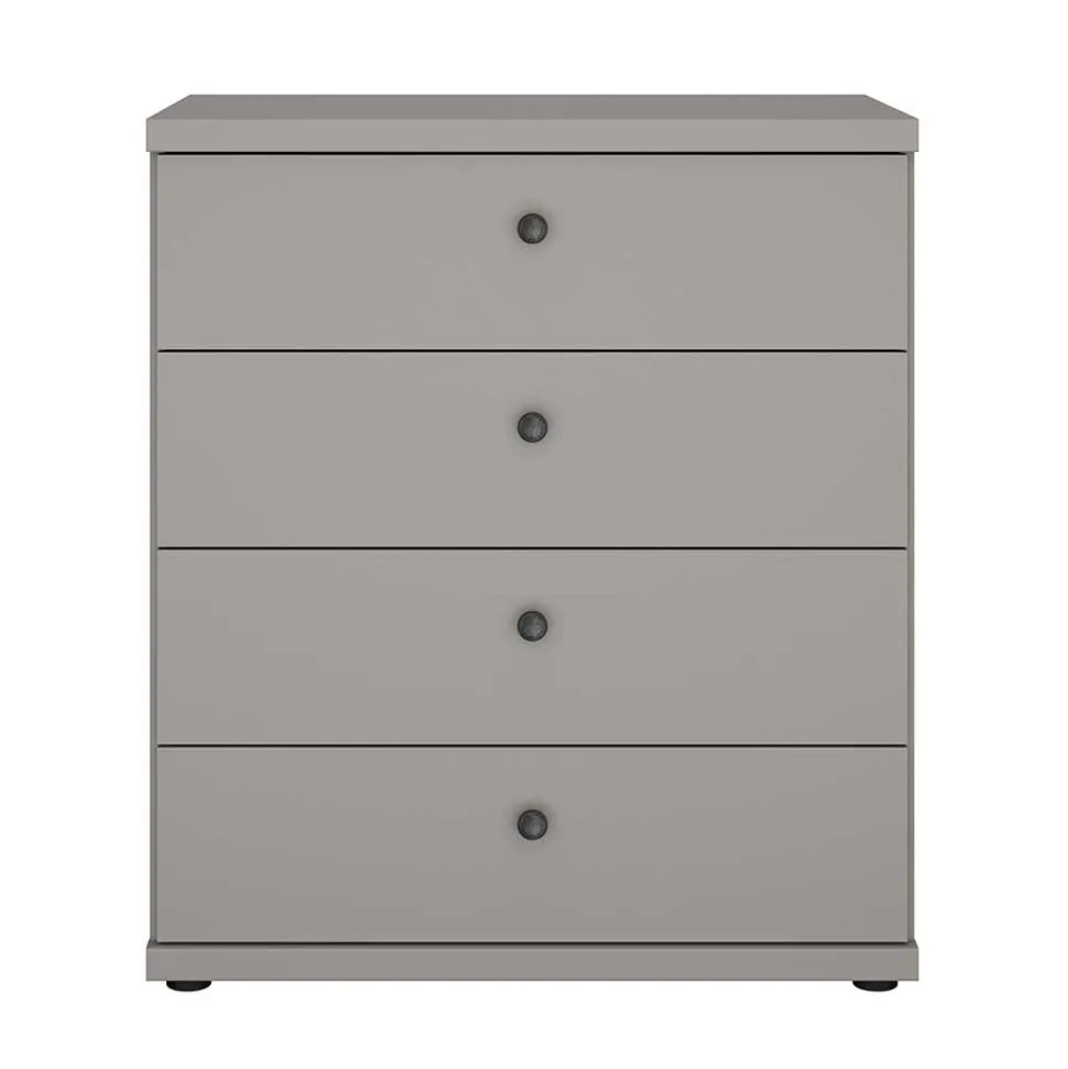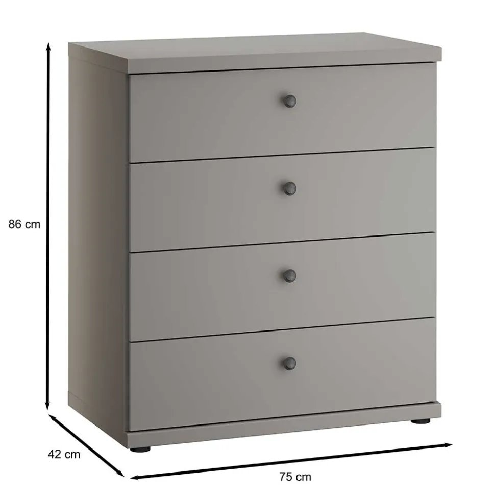 Mit einer Breite von 75 cm, einer Höhe von 86 cm und einer Tiefe von 42 cm bietet die Kommode „Ridonna“ reichlich Stauraum. Die vier geräumigen Schubladen sind mit einem Metallauszug ausgestattet, der ein leichtgängiges und komfortables Öffnen und Schließen gewährleistet. Abgerundet wird das Design durch dezente Knopfgriffe aus Metall in Altsilberfarben, die nicht nur eine edle Optik bieten, sondern auch haptisch überzeugen.