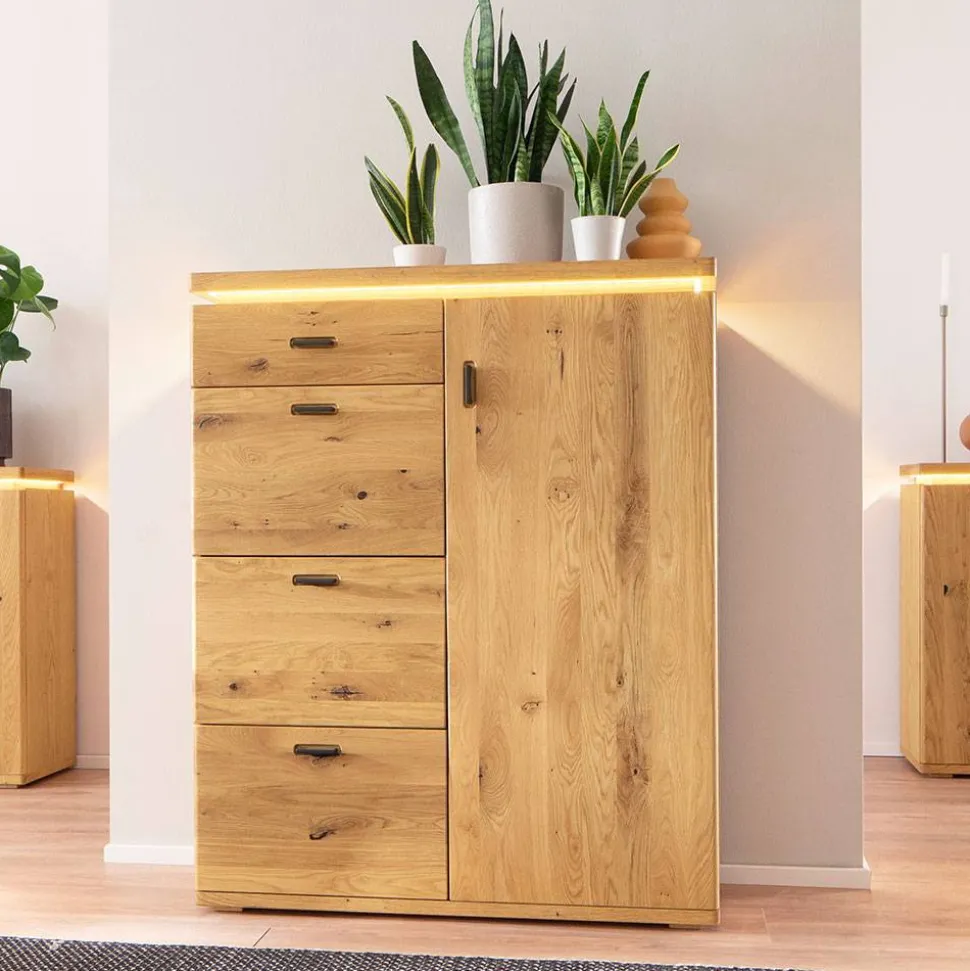 Unterhalb der Deckplatte befindet sich eine umlaufende LED-Beleuchtung, die die Stauraum-Bereiche elegant in Szene setzt. Mit der mitgelieferten Fernbedienung können Sie die Lichtquelle bequem steuern und für eine stimmungsvolle Atmosphäre sorgen.