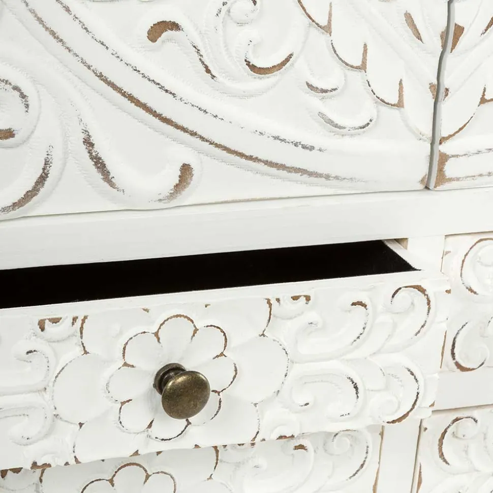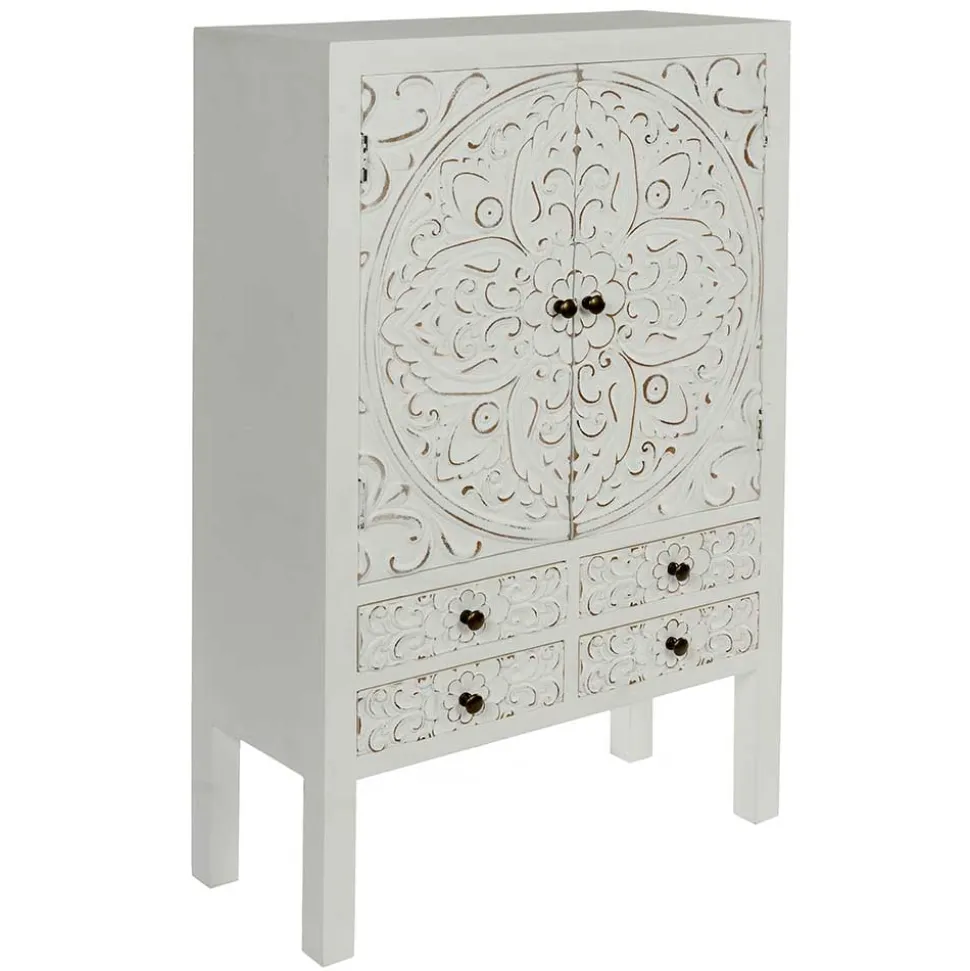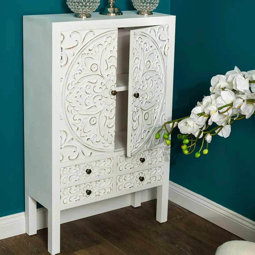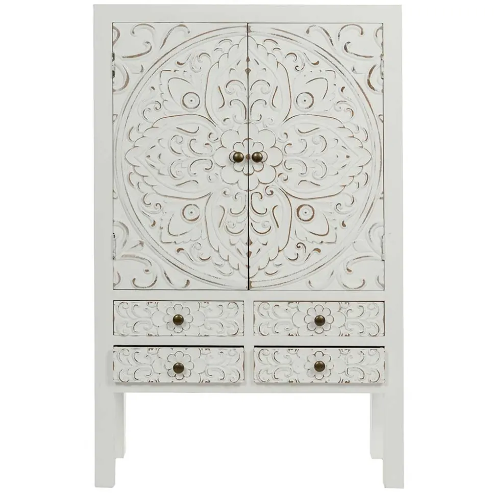 Acacio überzeugt nicht nur optisch, sondern auch funktional. Mit einer Breite von 63 cm, einer Höhe von 100 cm und einer Tiefe von lediglich 26 cm passt es selbst in kleinere Räume, ohne auf Stauraum zu verzichten. Im unteren Bereich finden sich vier praktische Schubladen, ideal für kleinere Gegenstände wie Schlüssel, Accessoires oder Dokumente. Hinter den zwei kunstvoll verzierten Türen mit altmessingfarbenen Metallknöpfen verbergen sich zwei Einlegeböden, die zusätzlichen Platz für Bücher, Geschirr oder dekorative Elemente bieten.