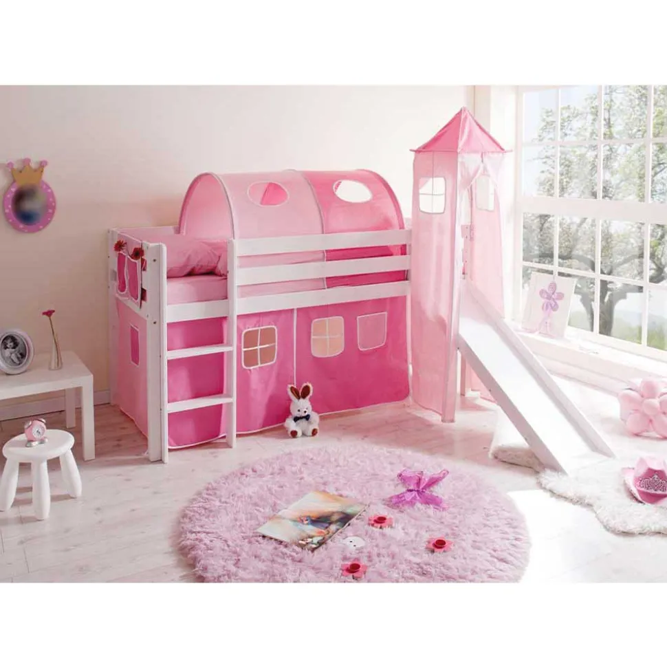 - Weißes Kinderhochbett mit rosa-pinken Vorhängen
