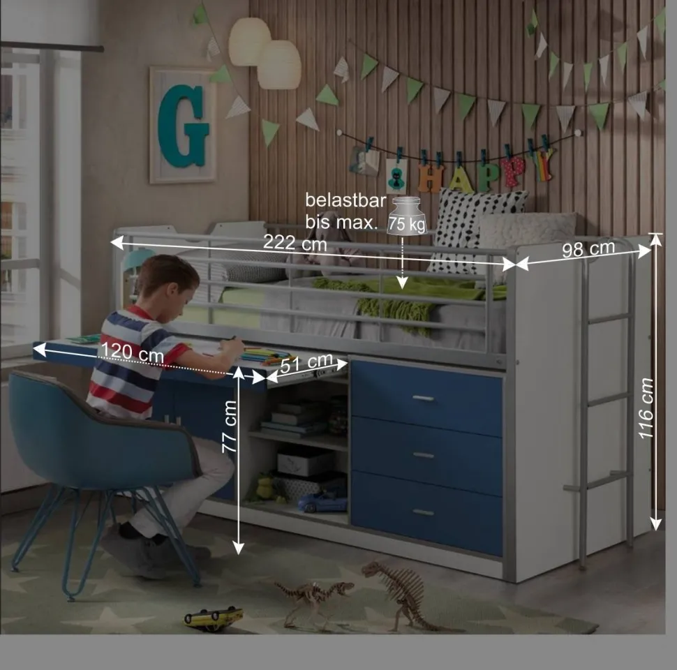 - Multifunktionelles Hochbett in Weiß/ Blau