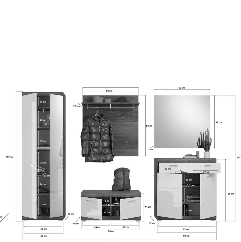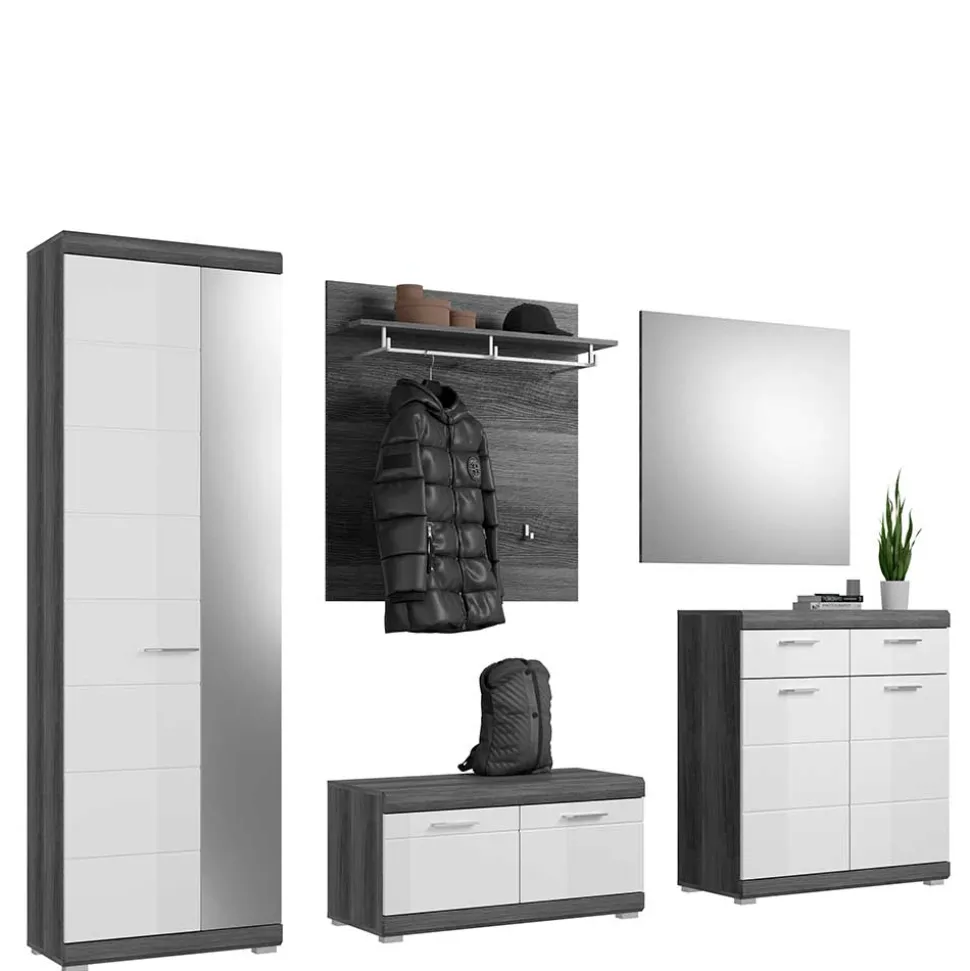 Mit dem fünfteiligem Flurmöbel-Set „Nancys“ zieht ein Hauch urbaner Eleganz in den Eingangsbereich ein. Das moderne Design besticht durch klare Linien, kontrastreiche Farben und eine funktionale Formensprache – typisch für den zeitgenössischen Wohnstil, der Ordnung, Stil und Zweckmäßigkeit harmonisch vereint. In der Kombination aus strahlendem Weiß Hochglanz und rauchgrauer Holzoptik entsteht ein attraktives Spiel aus Licht und Tiefe, das Ihren Flur nicht nur aufwertet, sondern regelrecht verwandelt.