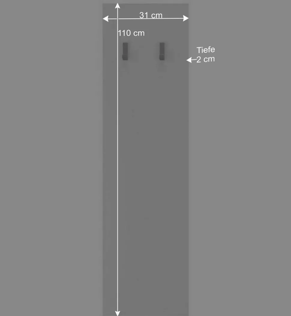 Schlank und elegant mit Maßen von 31 cm Breite, 110 cm Höhe und 2 cm Tiefe ist das Garderobenpaneel eine platzsparende Ergänzung. Die durchgehende Rückwand sorgt für Stabilität, während zwei robuste Kleiderhaken aus Metall praktischen Platz für Jacken, Mäntel oder Taschen bieten.