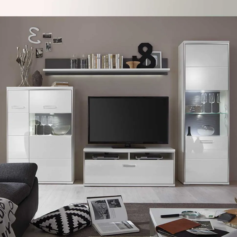 Entdecken Sie die Wohnwand „Tacroma“ – ein Meisterstück modernen Designs, das Eleganz und praktische Funktionalität in Ihrem Wohnzimmer vereint. Bestehend aus einem Highboard, einem TV-Element, einer Vitrine und einem Wandboard, bietet „Tacroma“ eine harmonische Kombination aus Stil und Ordnung.