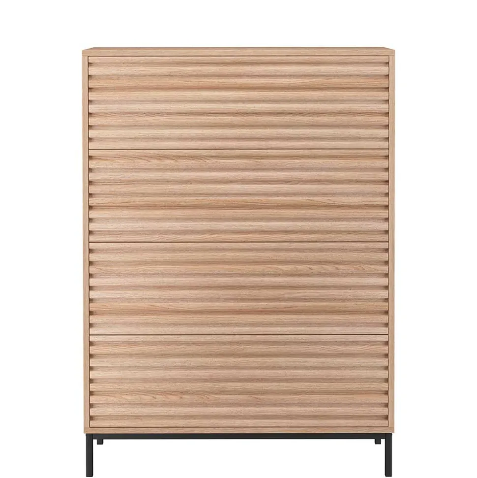 „Lunira“ überzeugt mit einer robusten Konstruktion aus MDF und Spanplatte, ergänzt durch ein filigranes, aber stabiles Metallgestell. Die pflegeleichten, in Eiche Natur folierten Oberflächen sorgen für eine warme Holzoptik, während dezente horizontale Rillen auf den Schubladenfronten das Design gekonnt auflockern. Das schwarze Vierfußgestell verleiht der Kommode eine moderne Leichtigkeit und gewährleistet sicheren Stand.