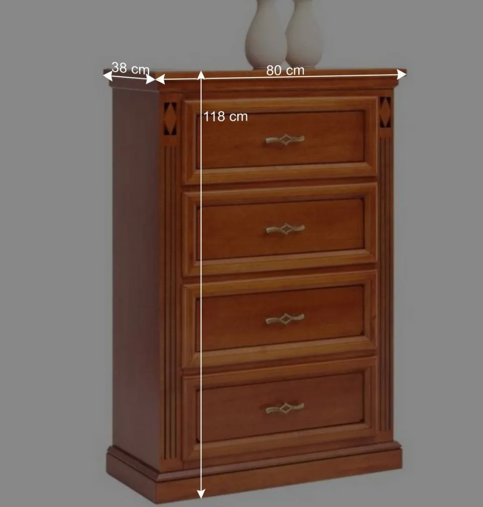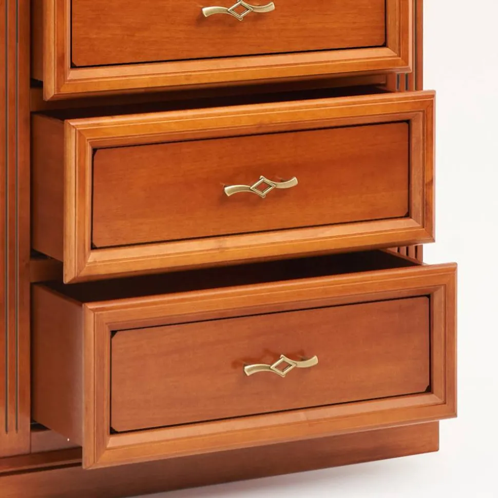 Gefertigt aus hochwertigem Holzwerkstoff, wurden die Oberflächen der Hochkommode aufwendig furniert, gebeizt und lackiert. Die abschließende Politur sorgt für einen authentischen Antik-Effekt, der die Kirschbaumoptik besonders edel zur Geltung bringt. Goldfarbene Metallgriffe setzen stilvolle Akzente und greifen das klassische Design elegant auf. Die handwerkliche Fertigung macht jedes Stück zu einem Unikat – kleine Maßabweichungen, Haarrisse oder Farbnuancen sind gewollt und unterstreichen die Individualität.