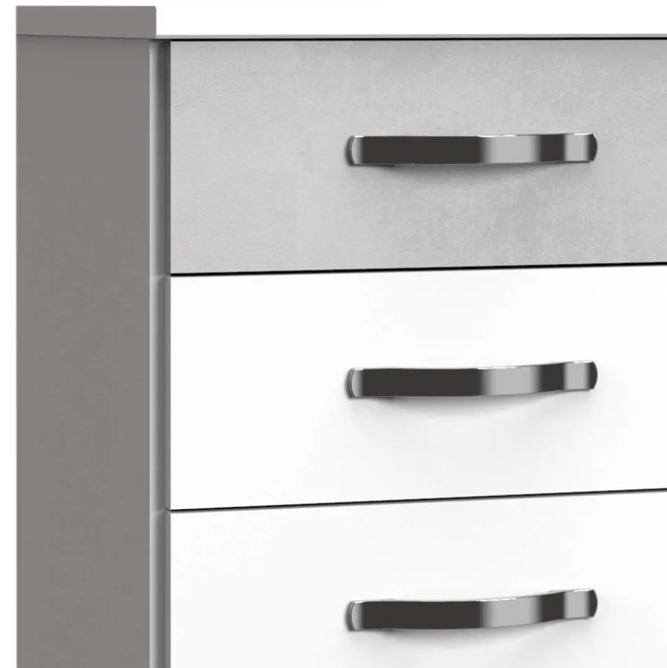 Gefertigt aus hochwertiger Spanplatte, bietet die Hochkommode „Hotti“ zahlreiche Vorteile. Spanplatte ist nicht nur robust und langlebig, sondern auch umweltfreundlich, da sie aus recyceltem Holz hergestellt wird. Die folierte Oberfläche in Weiß sowie Betonoptik-Lichtgrau verleiht der Kommode ein edles und zugleich zeitgemäßes Erscheinungsbild. Die Folierung schützt das Möbelstück vor Feuchtigkeit und Kratzern, wodurch es besonders pflegeleicht und langlebig wird.