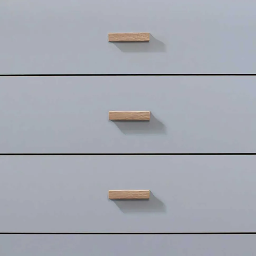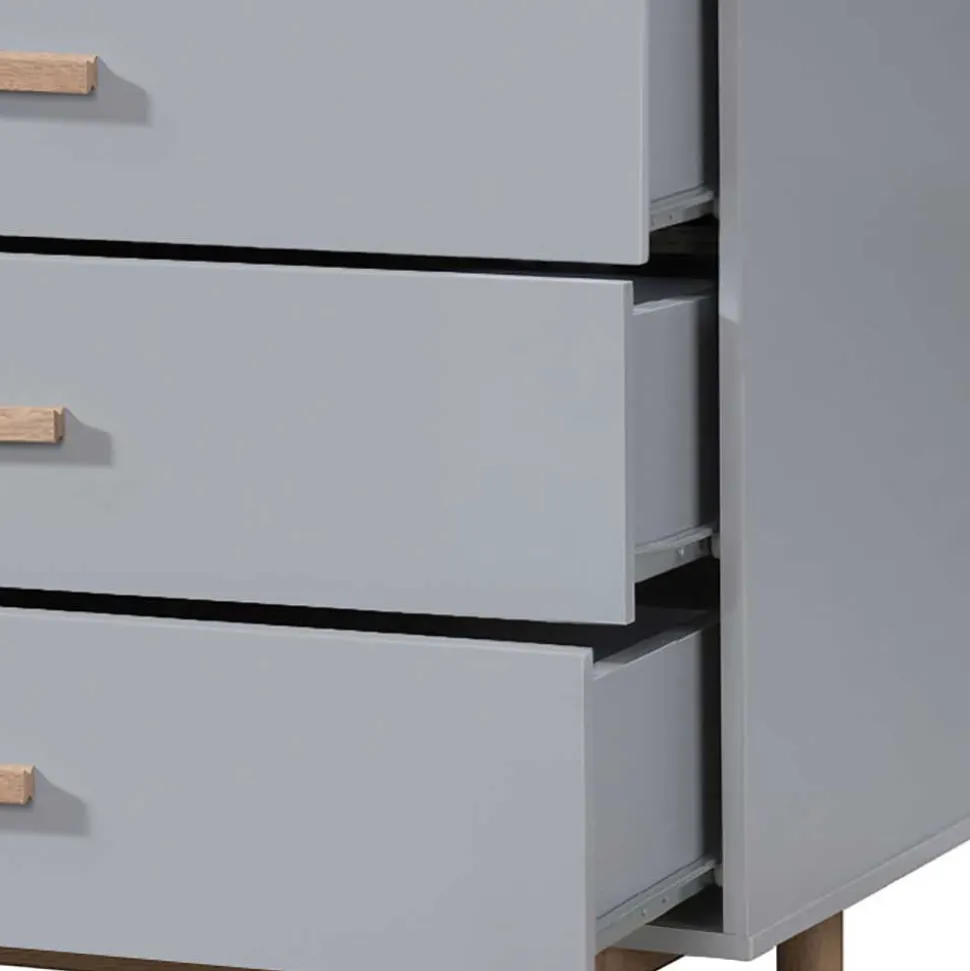 Gefertigt aus langlebigem Holzwerkstoff und foliert in Grau und Eiche Holzoptik, überzeugt die Kommode durch ihre pflegeleichten Oberflächen und ihr modernes Erscheinungsbild. Das Vierfußgestell mit dekorativer Blende und die handlichen Griffleisten in Eiche Optik runden das Design stimmig ab.