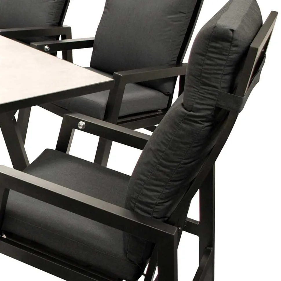 Das Design der Garten Sitzgruppe „Alpes“ verbindet klare Linien mit einer edlen Farbgebung in Dunkelgrau und Schwarz. Die Kombination aus filigranen Metallstrukturen, eleganten Stoffbezügen und einer stilvollen Glasplatte in Keramikoptik verleiht der Sitzgruppe eine moderne und zugleich zeitlose Ausstrahlung. Ob minimalistischer Stil oder moderne Gemütlichkeit – diese Sitzgruppe fügt sich perfekt in jede Umgebung ein und unterstreicht Ihre persönliche Note.