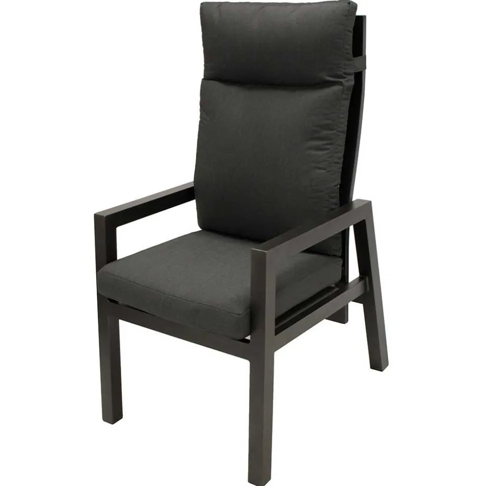 Die verstrebte Metall-Rückenlehne mit einer Höhe von 77 cm sorgt für zusätzliche Stabilität und ein modernes Design. Die breiten Armlehnen mit einer Höhe von 64 cm bieten zusätzlichen Komfort, während das standfeste Vierfußgestell für einen sicheren Halt sorgt. Die 8 cm starke Polsterauflage macht das Sitzen besonders angenehm – so genießen Sie stundenlangen Komfort, ohne Kompromisse.
