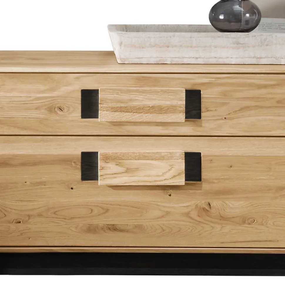 Die Fronten der Wohnwand sind aus massiver Wildeiche gefertigt, während der Korpus aus hochwertigem Eiche-Massivholz besteht. Dadurch entsteht ein faszinierender Kontrast, der Ihrem Raum Charakter und Wärme verleiht. Bitte beachten Sie, dass Äste, kleine Risse und andere Unebenheiten bewusst als Merkmal dieser Möbelstücke gewählt wurden, um den natürlichen Charme der Wildeiche zu betonen.
