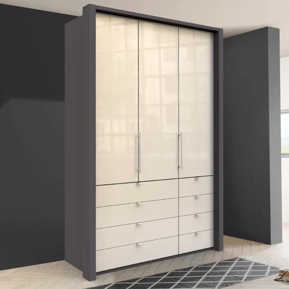 Eintauchen in die Welt des modernen Wohnens beginnt mit der Auswahl der richtigen Möbel, die Design und Praktikabilität in einem harmonischen Gesamtbild vereinen. Der Kleiderschrank „Nasses“ aus deutscher Produktion repräsentiert genau diese Verbindung. Gefertigt aus solider Spanplatte, bietet dieser Schrank nicht nur eine robuste Konstruktion, sondern auch ein elegantes Design, das in jedem Schlafzimmer zum Blickfang wird. Die cremefarbene Glasbeschichtung der Front und der in Braun folierte Korpus erzeugen ein ansprechendes zweifarbiges Design, das sowohl moderne als auch klassische Einrichtungsstile ergänzt.