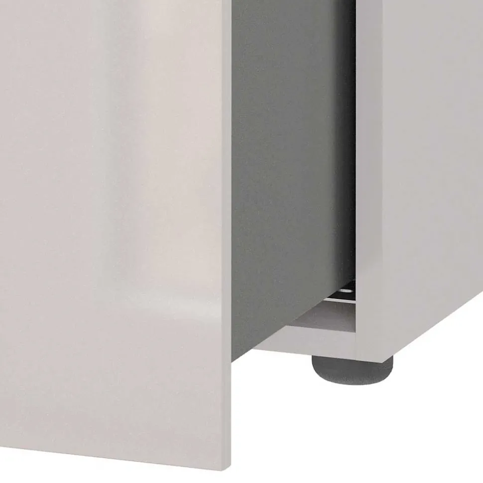 Komplett gefertigt aus robuster Spanplatte, bietet Aquara eine solide und langlebige Basis. Spanplatten zeichnen sich durch hohe Formstabilität und Belastbarkeit aus und eignen sich besonders gut für moderne Möbelkonstruktionen. Die Oberfläche ist melaminbeschichtet, was nicht nur für ein edles Finish sorgt, sondern auch Schutz vor Kratzern, Feuchtigkeit und alltäglicher Abnutzung bietet. Zusätzlich wird die Deckplatte von einer eleganten Sicherheitsglas-Auflage geschützt – ideal für Dekoration oder technische Geräte. Die Front erhält durch ihre Glasbeschichtung eine besonders hochwertige Optik und lässt sich gleichzeitig leicht reinigen. Schwarze Metallgriffe mit Pulverbeschichtung sind kratzfest, langlebig und setzen einen ausdrucksstarken Kontrast zur hellgrauen Oberfläche. Stoßfeste ABS-Kanten sorgen zusätzlich für Schutz an den empfindlichen Rändern und machen Aquara zu einem langlebigen und alltagstauglichen Möbelstück.