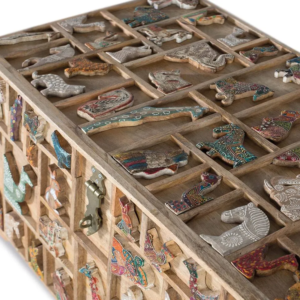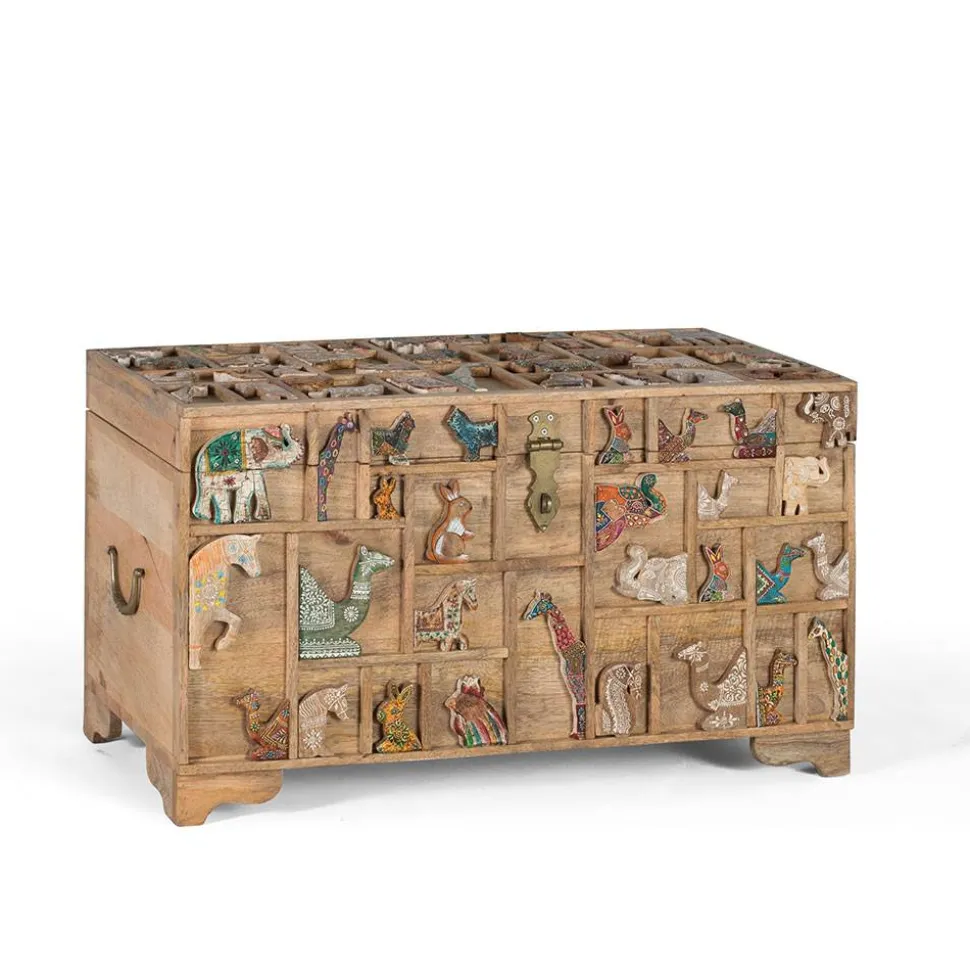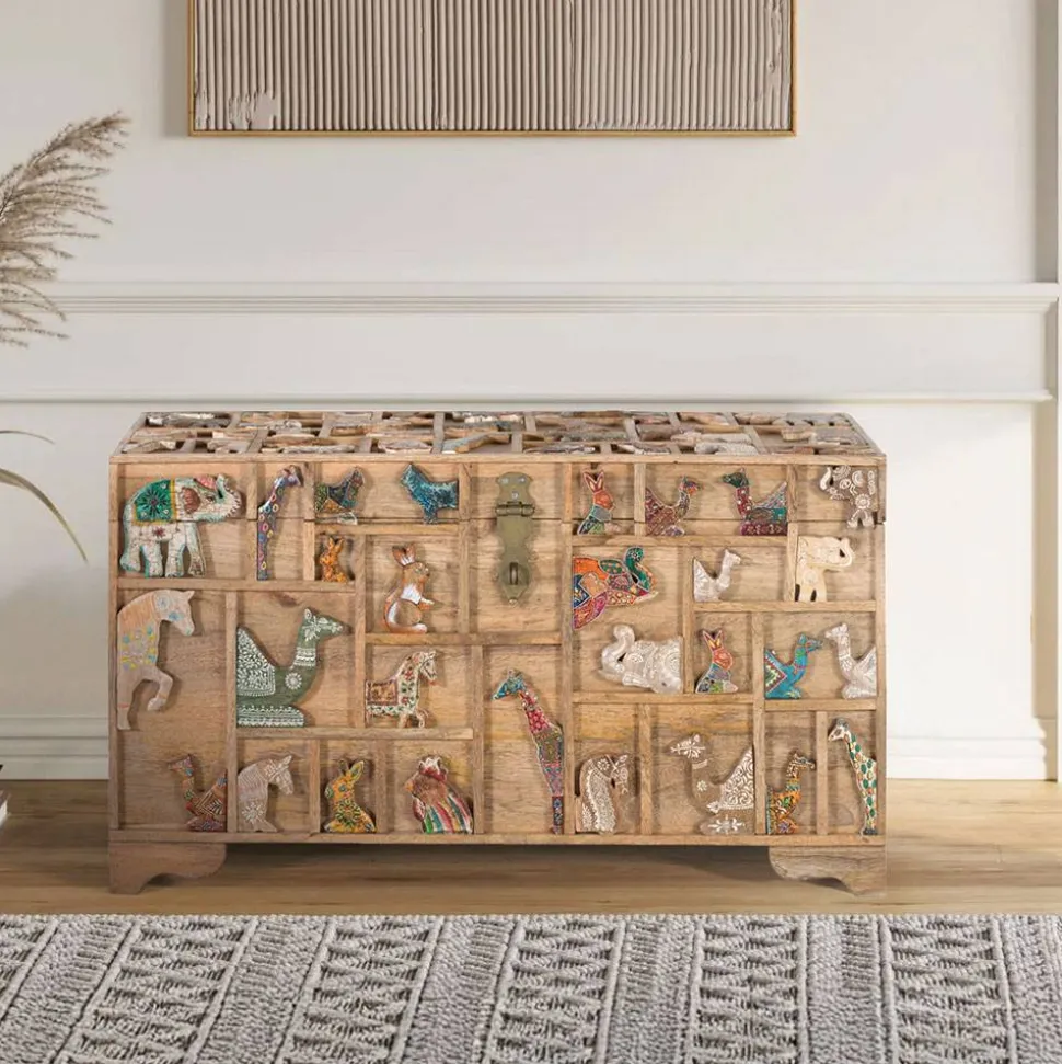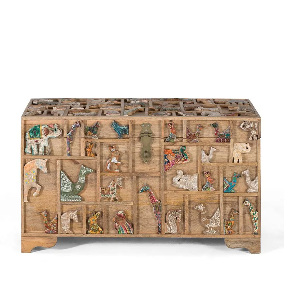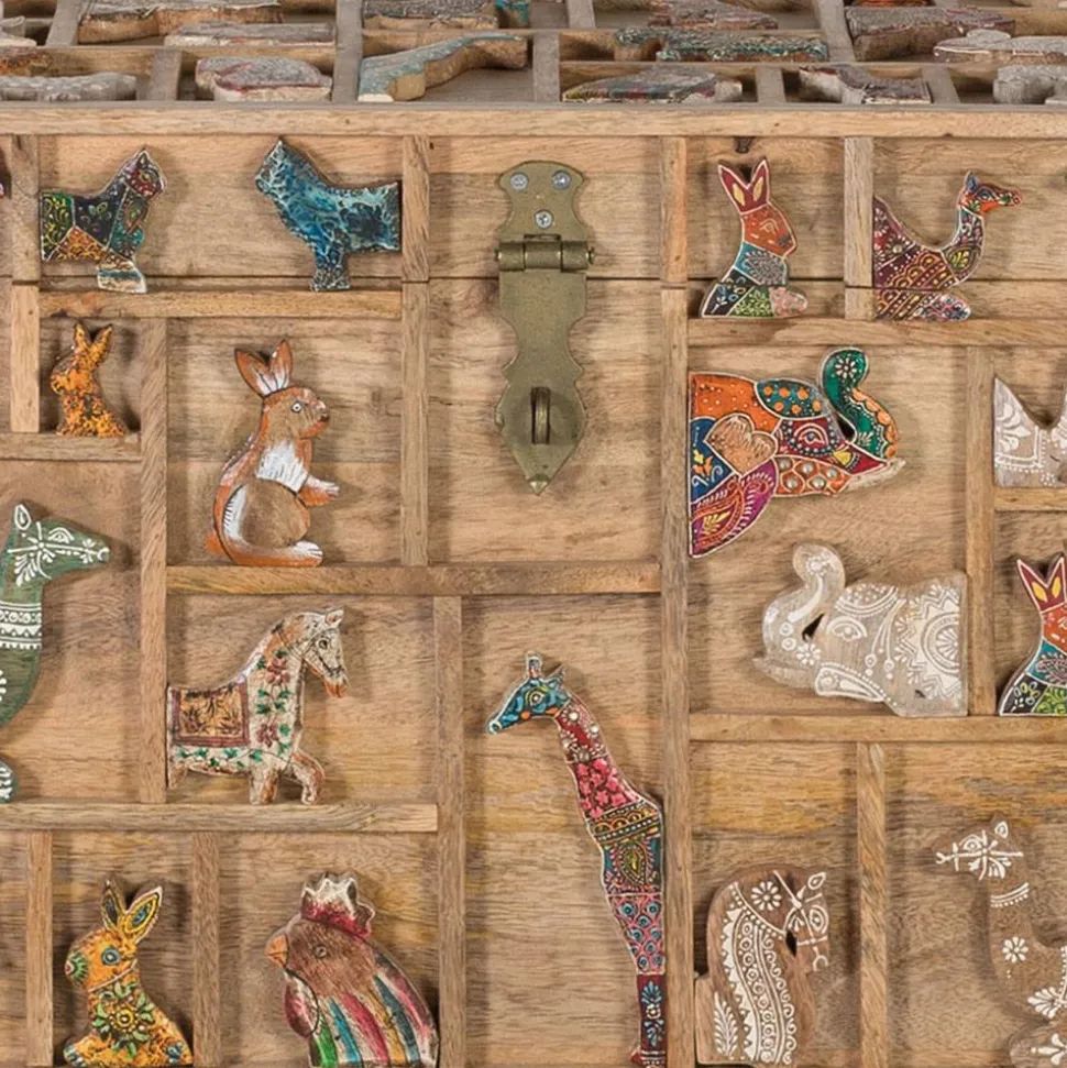 Ein besonderes Highlight ist die liebevoll verzierte Front sowie der aufwendig gestaltete Deckel. Die Oberfläche ist durch filigrane Leisten in unterschiedliche rechteckige und quadratische Segmente unterteilt, die an einen kunstvollen Setzkasten erinnern. Innerhalb dieser Felder finden sich plastische, farblich variierende Tiermotive – mal dezent in Weiß gehalten, mal kunstvoll bunt bemalt oder mit detailreichen Mustern versehen. Diese verspielte, aber dennoch harmonische Gestaltung macht die Truhe zu einem einzigartigen Blickfang.