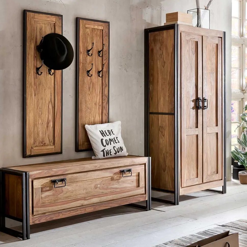 Ein stilvoller Empfangsbereich ist das Aushängeschild eines jeden Zuhauses – und genau hier setzt das Garderobenmöbel-Set „Mendoza“ neue Maßstäbe. Mit seiner kraftvollen Kombination aus robustem Metall und charaktervollem Akazienholz bringt es den markanten Industrial und Loft Stil direkt in Ihren Eingangsbereich. Diese Möbel verkörpern Authentizität, Klarheit und urbane Lässigkeit – perfekt für alle, die Individualität lieben und leben.
