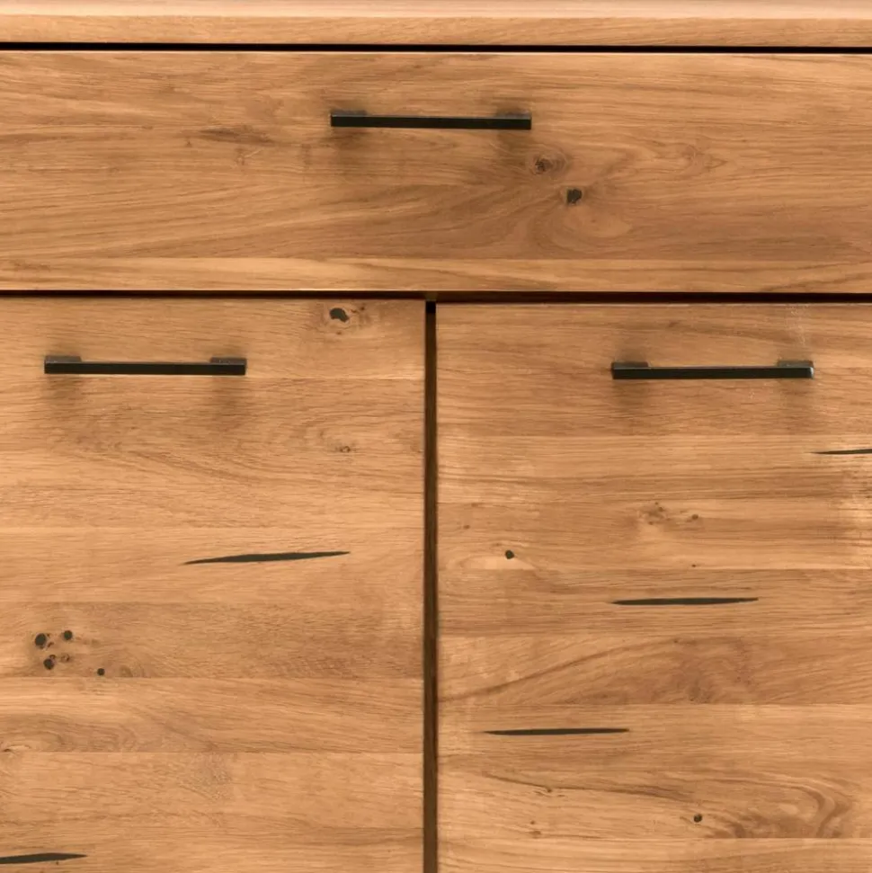 Massives Wildeicheholz bildet das Herzstück dieser Kommode – spürbar robust, charaktervoll und von faszinierender Lebendigkeit. Die offenporige Oberfläche ist mit einem natürlichen Öl behandelt, das nicht nur die markante Maserung betont, sondern auch die Haptik des Holzes bewahrt. Jeder Griff über die Fläche wird zum sinnlichen Erlebnis – warm, natürlich, einladend. Wildeiche ist besonders hart und widerstandsfähig – perfekt für alle, die sich langlebige Qualität mit echtem Naturgefühl wünschen.