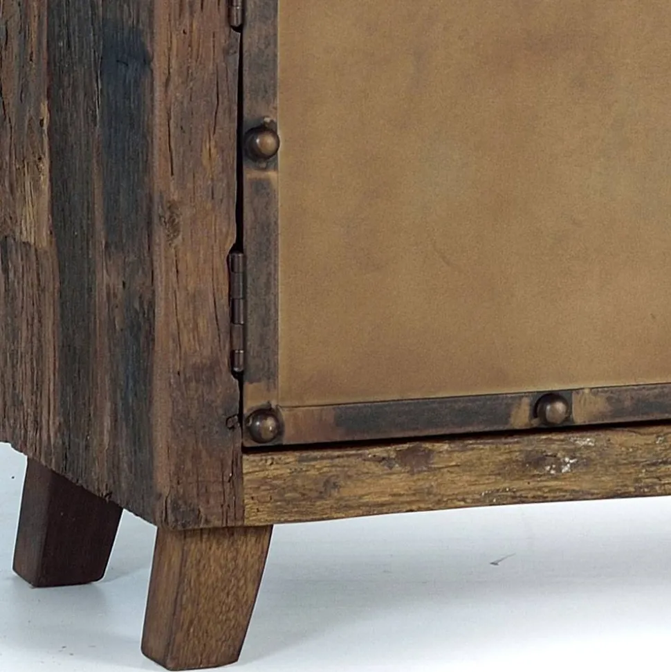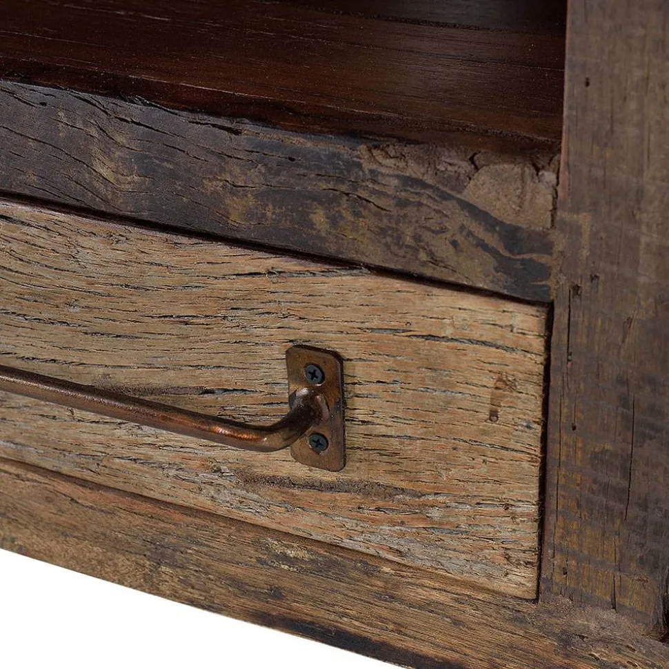 Die TV-Kommode „Stock“ ist nicht nur optisch ein Highlight, sondern auch funktional bestens ausgestattet. Das Möbelstück besteht aus massivem Altholz, dessen natürliche Gebrauchsspuren und charakteristische Risse jedes Stück zu einem einzigartigen Unikat machen. Das stabile Fußgestell aus Massivholz sorgt für sicheren Stand und verleiht dem Design einen soliden, stabilen Charakter. Ergänzt wird das Möbelstück durch Metall-Elemente, die in verschiedenen Oxidationsschattierungen glänzen und ihm einen besonders rustikalen Touch verleihen. Lange Metallbügelgriffe in Altmessingfarben runden das Gesamtbild ab und setzen zusätzliche Akzente.
