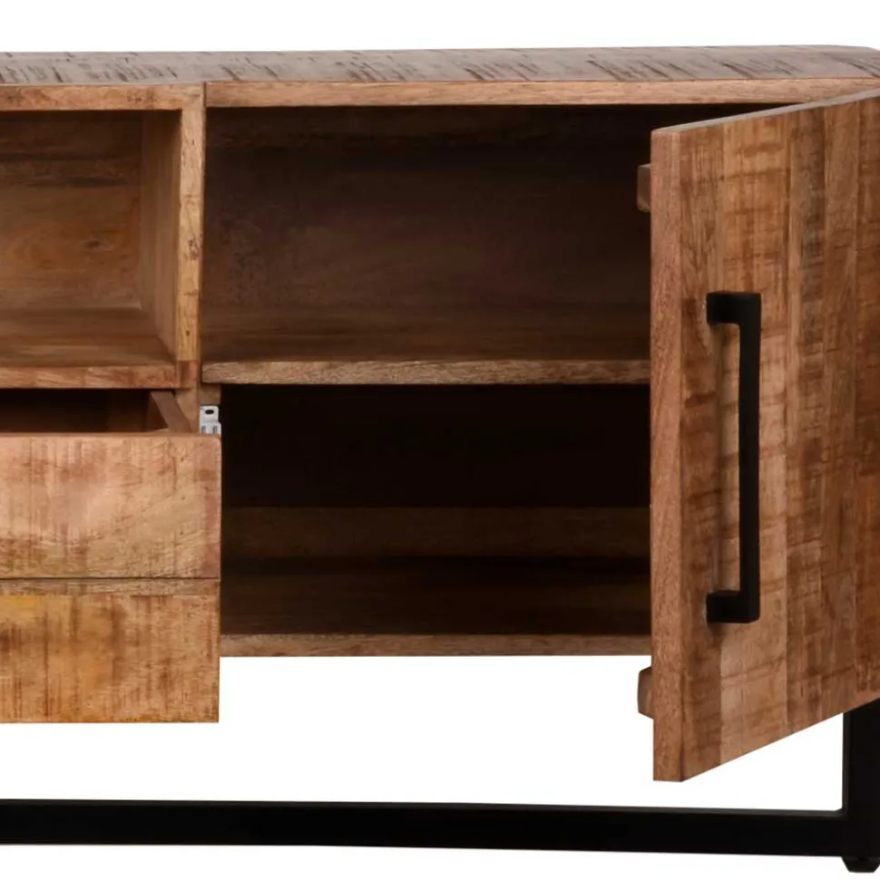 Gefertigt aus massivem Mangobaumholz und Metall, überzeugt das TV-Lowboard nicht nur durch seine außergewöhnliche Optik, sondern auch durch seine erstklassige Qualität und Langlebigkeit. Mangobaumholz ist nicht nur besonders stabil, sondern besticht auch durch seine natürliche Maserung und Widerstandsfähigkeit gegenüber äußeren Einflüssen. Das Metallbügelgestell verleiht dem Lowboard nicht nur Stabilität, sondern auch einen markanten industriellen Charme.