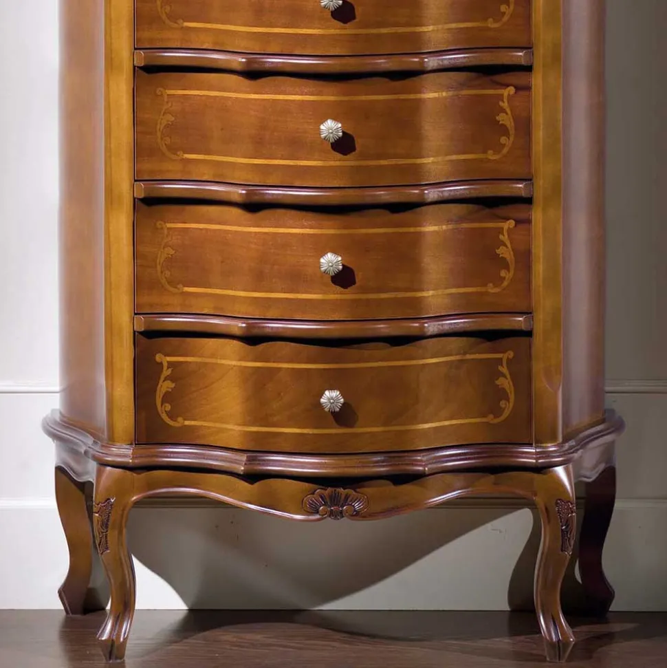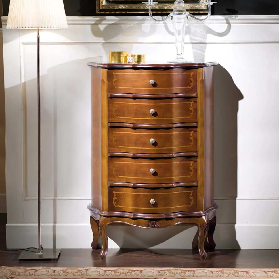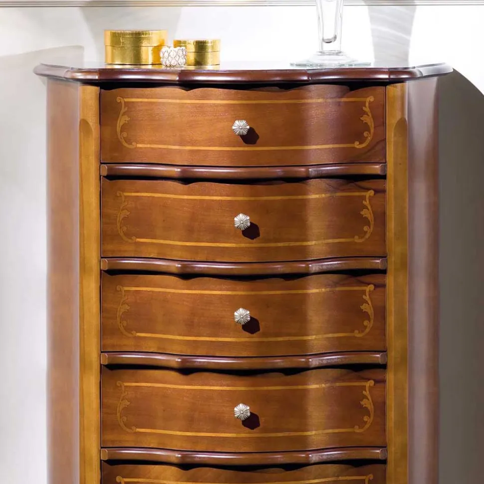 Mit seinen ansprechenden Profilkanten und der seitlich leicht abgeschrägten, rechteckigen Form, bietet das Möbelstück nicht nur ein ästhetisch ansprechendes Design, sondern auch viel Stauraum. Die Maße von 78 cm Breite, 106 cm Höhe und 36 cm Tiefe ermöglichen es Ihnen, Ihre persönlichen Gegenstände in fünf untereinander angeordneten Pappelholzschubladen zu verstauen. Diese Schubladen sind auf Holzauszügen montiert und mit handgearbeiteten, aufwendigen Intarsien verziert, die das edle Gesamtbild abrunden.